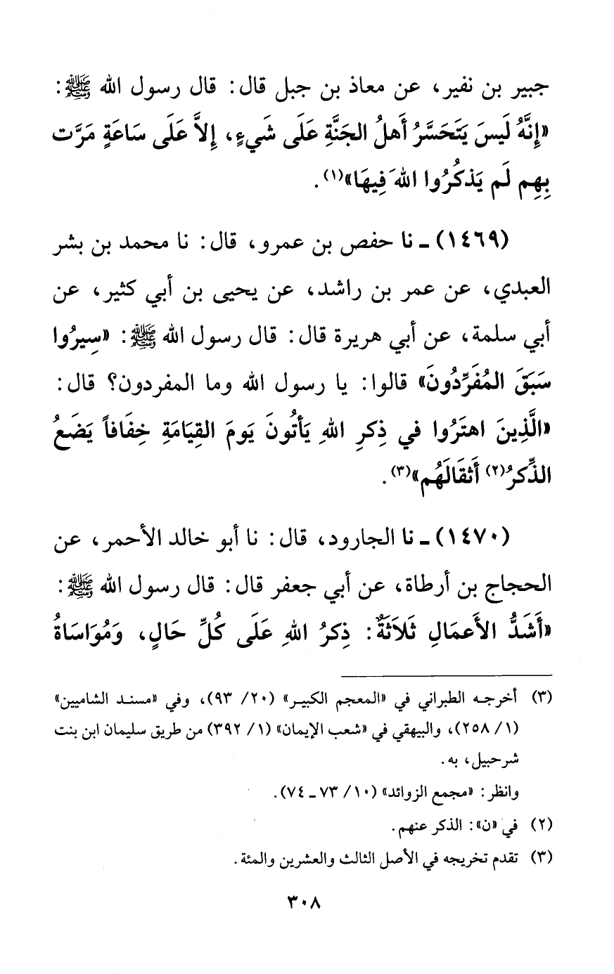 1469 - نا حفص بن عمرو، قال: نا محمد بن بشر العبدي، عن عمر بن راشد، عن يحيى بن أبي كثير، عن أبي سلمة، عن أبي هريرة قال: قال رسول الله صلى الله عليه وسلم: ((سيروا سبق المفردون)) قالوا: يا رسول الله وما المفردون؟ قال: ((الذين اهتروا في ذكر الله يأتون يوم القيامة خفافاً يضع الذكر أثقالهم)).
