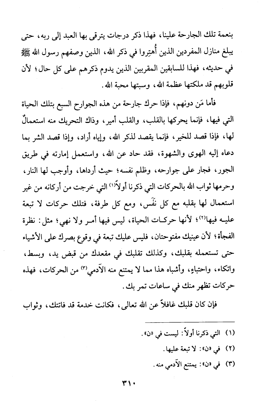 فأما من دونهم، فإذا حرك جارحة من هذه الجوارح السبع بتلك الحياة التي فيها، فإنما يحركها بالقلب، والقلب أمير، وذاك التحريك منه استعمالٌ لها، فإذا قصد للخير، فإنما يقصد لذكر الله، وإياه أراد، وإذا قصد الشر بما دعاه إليه الهوى والشهوة، فقد حاد عن الله، واستعمل إمارته في طريق الجور، فجار على جوارحه، وظلم نفسه؛ حيث أرداها، وأوجب لها النار، وحرمها ثواب الله بالحركات التي ذكرنا أولاً التي خرجت من أركانه من غير استعمال لها بقلبه مع كل نفس، ومع كل طرفة، فتلك حركات لا تبعة عليه فيها؛ لأنها حركات الحياة، ليس فيها أمر ولا نهي؛ مثل: نظرة الفجأة؛ لأن عينيك مفتوحتان، فليس عليك تبعة في وقوع بصرك على الأشياء حتى تستعمله بقلبك، وكذلك تقلبك في مقعدك من قبض يد، وبسط، واتكاء، واحتباءٍ، وأشباه هذا مما لا يمتنع منه الآدمي من الحركات، فهذه حركات تظهر منك في ساعات تمر بك.
