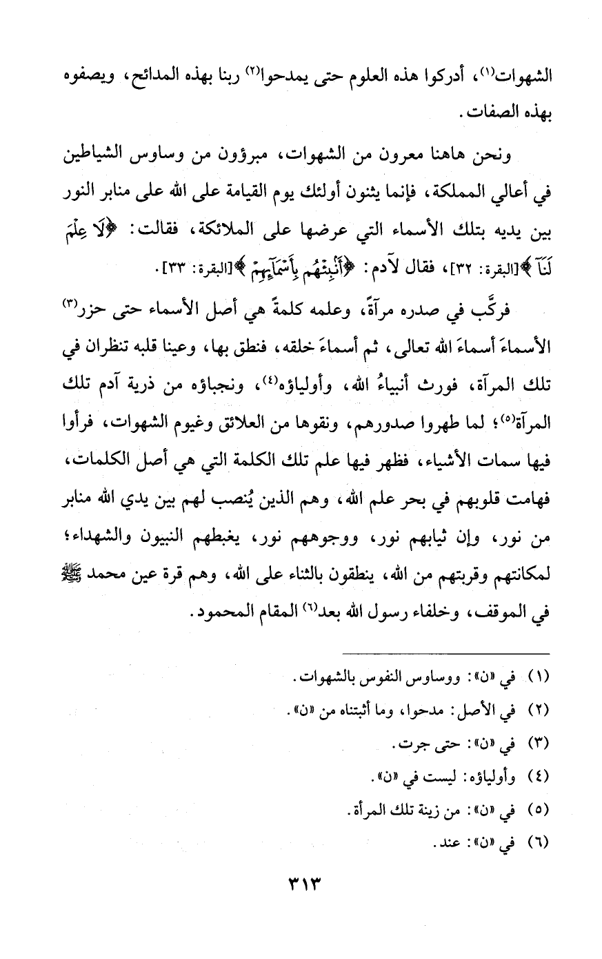 فركب في صدره مرآةً، وعلمه كلمةً هي أصل الأسماء حتى حزر الأسماء أسماء الله تعالى، ثم أسماء خلقه، فنطق بها، وعينا قلبه تنظران في تلك المرآة، فورث أنبياء الله، وأولياؤه، ونجباؤه من ذرية آدم تلك المرآة؛ لما طهروا صدورهم، ونقوها من العلائق وغيوم الشهوات، فرأوا فيها سمات الأشياء، فظهر فيها علم تلك الكلمة التي هي أصل الكلمات، فهامت قلوبهم في بحر علم الله، وهم الذين ينصب لهم بين يدي الله منابر من نور، وإن ثيابهم نور، ووجوههم نور، يغبطهم النبيون والشهداء؛ لمكانتهم وقربتهم من الله، ينطقون بالثناء على الله، وهم قرة عين محمد صلى الله عليه وسلم في الموقف، وخلفاء رسول الله بعد المقام المحمود.