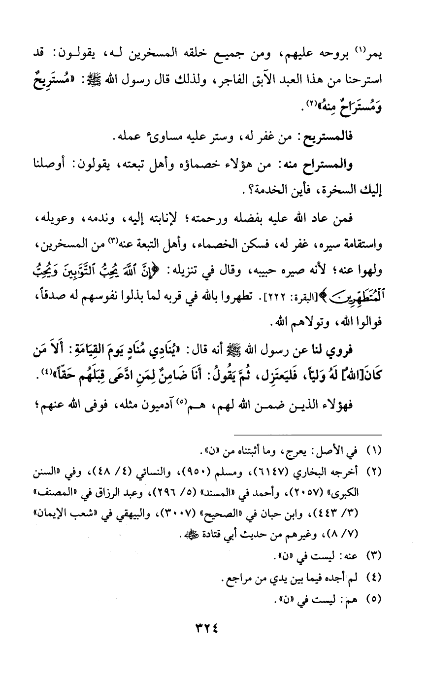 فروي لنا عن رسول الله صلى الله عليه وسلم أنه قال: ((ينادي منادٍ يوم القيامة: ألا من كان [الله] له ولياً، فليعتزل، ثم يقول: أنا ضامنٌ لمن ادعى قبلهم حقاً)).