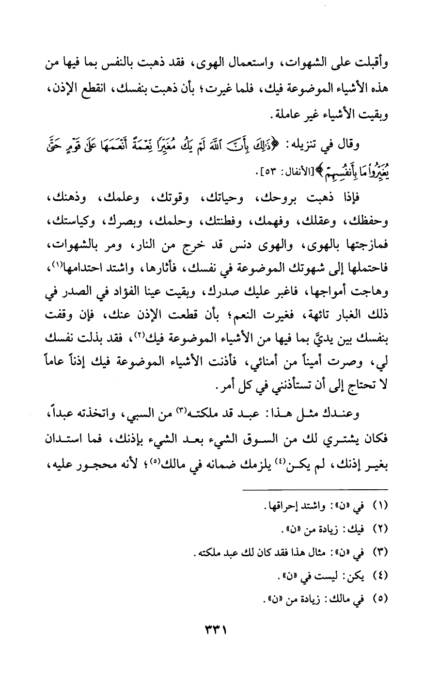 فإذا ذهبت بروحك، وحياتك، وقوتك، وعلمك، وذهنك، وحفظك، وعقلك، وفهمك، وفطنتك، وحلمك، وبصرك، وكياستك، فمازجتها بالهوى، والهوى دنس قد خرج من النار، ومر بالشهوات، فاحتملها إلى شهوتك الموضوعة في نفسك، فأثارها، واشتد احتدامها، وهاجت أمواجها، فاغبر عليك صدرك، وبقيت عينا الفؤاد في الصدر في ذلك الغبار تائهة، فغيرت النعم؛ بأن قطعت الإذن عنك، فإن وقفت بنفسك بين يدي بما فيها من الأشياء الموضوعة فيك، فقد بذلت نفسك لي، وصرت أميناً من أمنائي، فأذنت الأشياء الموضوعة فيك إذناً عاماً لا تحتاج إلى أن تستأذنني في كل أمر.