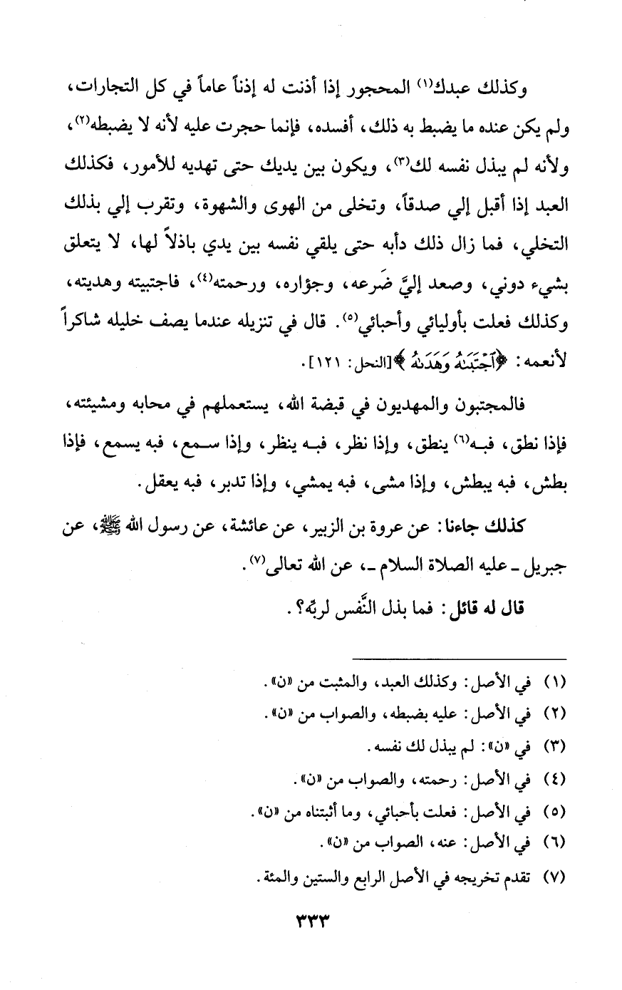 وكذلك عبدك المحجور إذا أذنت له إذناً عاماً في كل التجارات، ولم يكن عنده ما يضبط به ذلك، أفسده، فإنما حجرت عليه لأنه لا يضبطه، ولأنه لم يبذل نفسه لك، ويكون بين يديك حتى تهديه للأمور، فكذلك العبد إذا أقبل إلي صدقاً، وتخلى من الهوى والشهوة، وتقرب إلي بذلك التخلي، فما زال ذلك دأبه حتى يلقي نفسه بين يدي باذلاً لها، لا يتعلق بشيء دوني، وصعد إلي ضرعه، وجؤاره، ورحمته، فاجتبيته وهديته، وكذلك فعلت بأوليائي وأحبائي. قال في تنزليه عندما يصف خليله شاكراً لأنعمه: {اجتباه وهداه}.