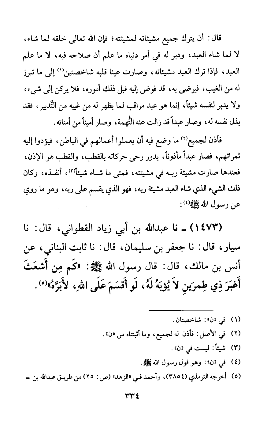 1473 - نا عبد الله بن أبي زياد القطواني، قال: نا سيار، قال: نا جعفر بن سليمان، قال: نا ثابت البناني، عن أنس بن مالك، قال: قال رسول الله صلى الله عليه وسلم: ((كم من أشعث أغبر ذي طمرين لا يؤبه له، لو أقسم على الله، لأبره)).