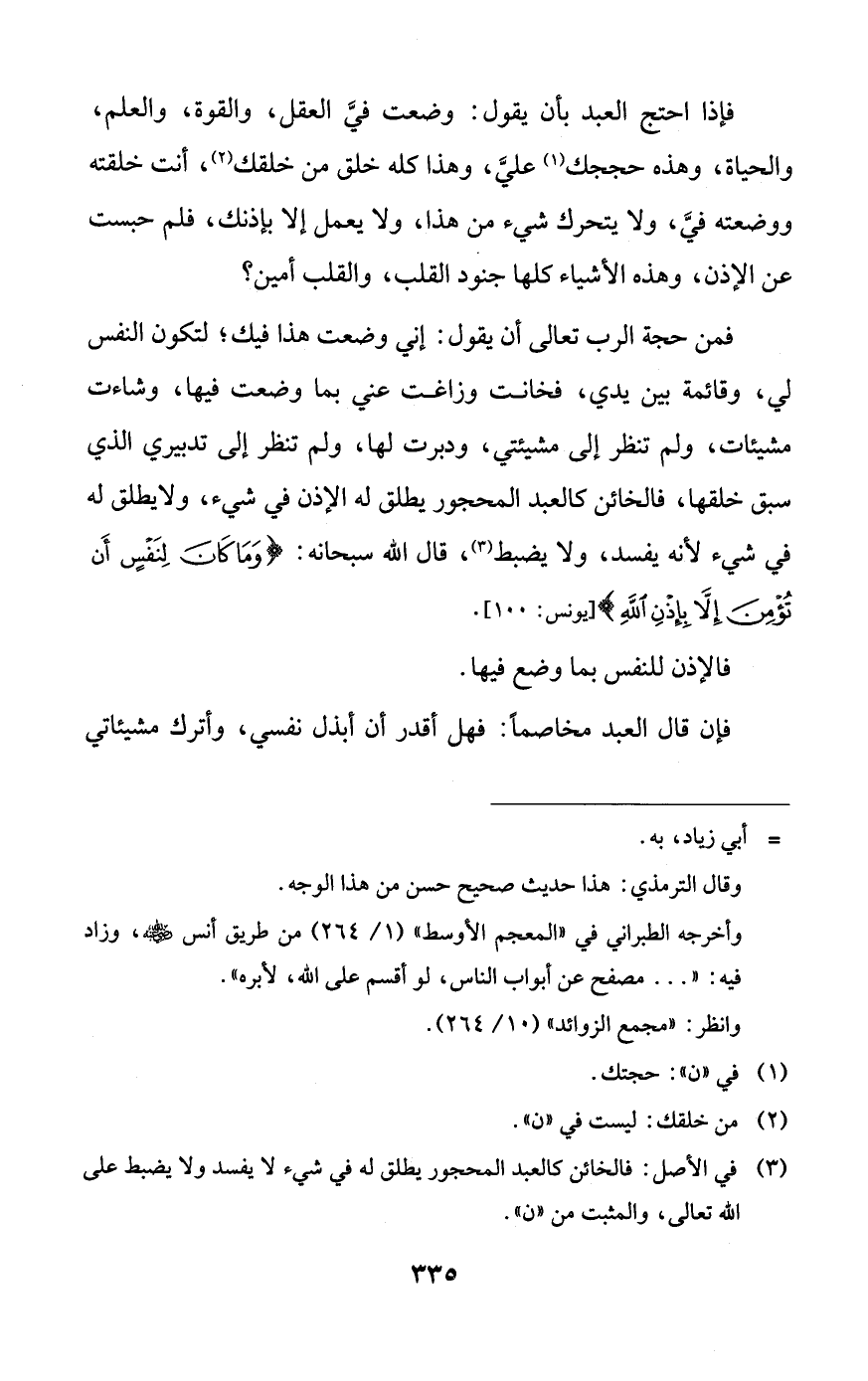 فمن حجة الرب تعالى أن يقول: إني وضعت هذا فيك، لتكون النفس لي، وقائمة بين يدي، فخانت وزاغت عني بما وضعت فيها، وشاءت مشيئات، ولم تنظر إلى مشيئتي، ودبرت لها، ولم تنظر إلى تدبيري الذي سبق خلقها، فالخائن كالعبد المحجور يطلق له الإذن في شيء، ولا يطلق له في شيء لأنه يفسد، ولا يضبط، قال الله سبحانه: {وما كان لنفسٍ أن تؤمن إلا بإذن الله}.