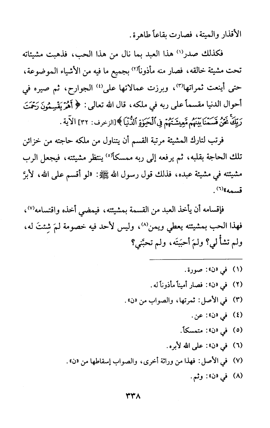 فكذلك صدر هذا العبد بما نال من هذا الحب، فذهبت مشيئاته تحت مشيئة خالقه، فصار منه مأذوناً بجميع ما فيه من الأشياء الموضوعة، حتى أينعت ثمراتها، وبرزت عمالاتها على الجوارح، ثم صيره في أحوال الدنيا مقسماً على ربه في ملكه، قال الله تعالى: {أهم يقسمون رحمت ربك نحن قسمنا بينهم معيشتهم في الحياة الدنيا} الآية.