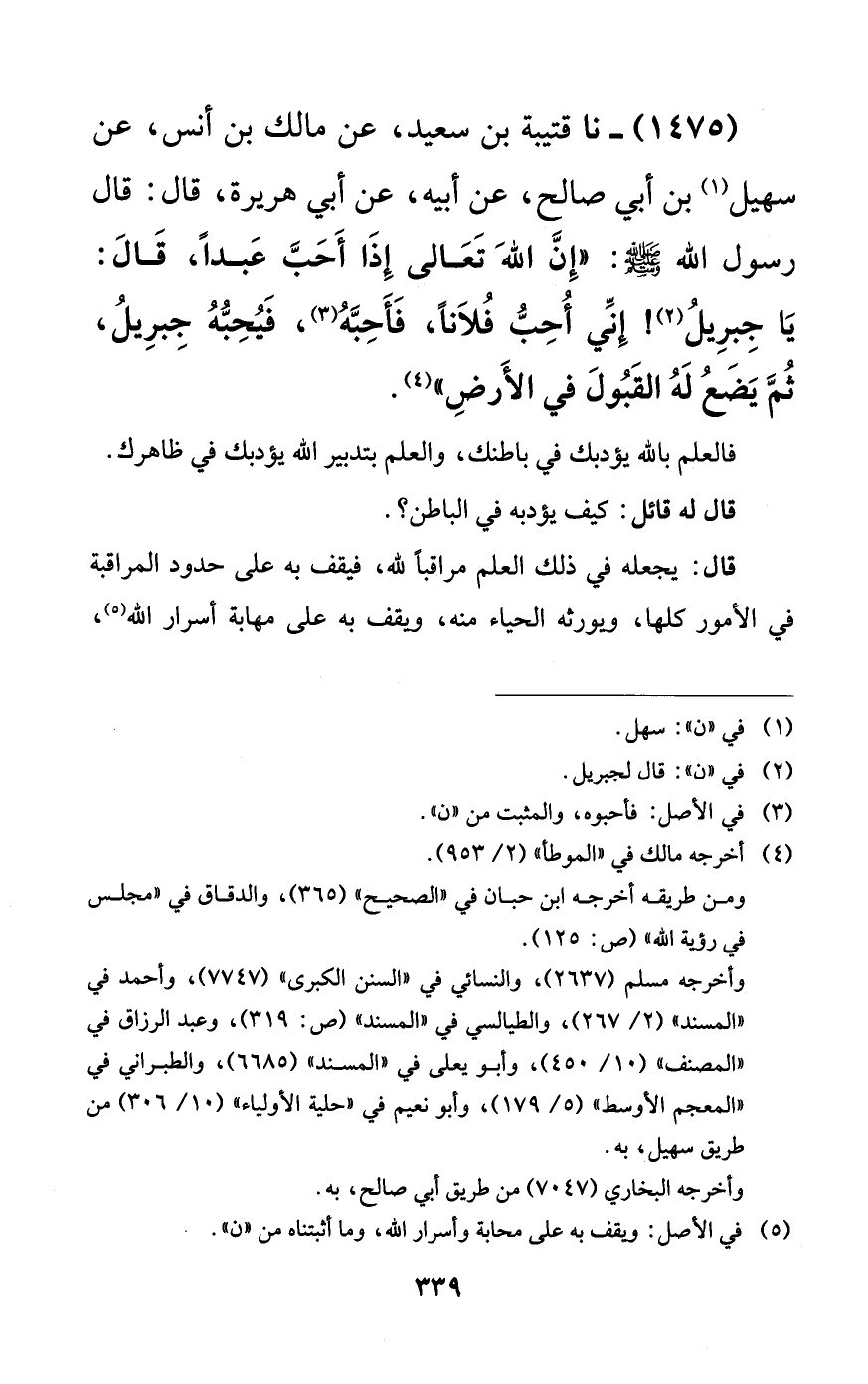 1475 - نا قتيبة بن سعيد، عن مالك بن أنس، عن سهيل بن أبي صالح، عن أبيه، عن أبي هريرة، قال: قال رسول الله صلى الله عليه وسلم: ((إن الله تعالى إذا أحب عبداً، قال: يا جبريل! إني أحب فلاناً، فأحبه، فيحبه جبريل، ثم يضع له القبول في الأرض)).