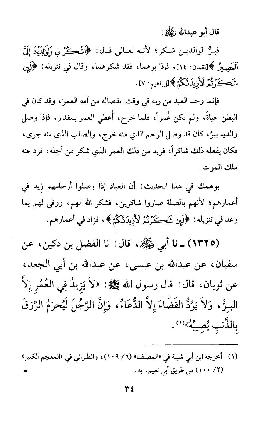 1325 - نا أبي رحمه الله، قال: نا الفضل بن دكين، عن سفيان، عن عبد الله بن عيسى، عن عبد الله بن أبي الجعد، عن ثوبان، قال: قال رسول الله صلى الله عليه وسلم: ((لا يزيد في العمر إلا البر، ولا يرد القضاء إلا الدعاء، وإن الرجل ليحرم الرزق بالذنب يصيبه)).