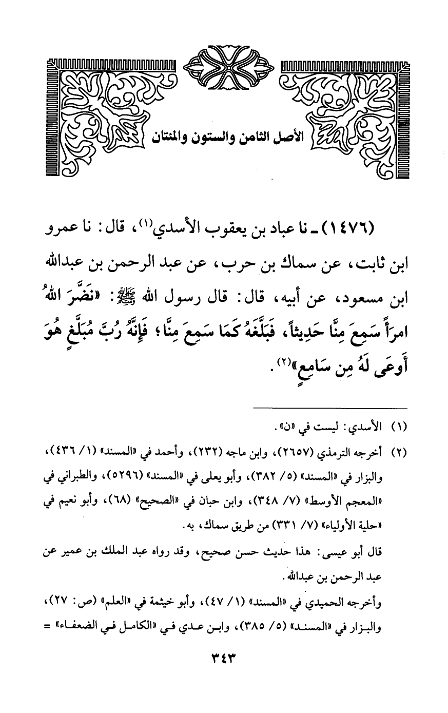 1476 - نا عباد بن يعقوب الأسدي، قال: نا عمرو ابن ثابت، عن سماك بن حرب، عن عبد الرحمن بن عبد الله ابن مسعود، عن أبيه، قال: قال رسول الله صلى الله عليه وسلم: ((نضر الله امرأً سمع منا حديثاً، فبلغه كما سمع منا؛ فإنه رب مبلغٍ هو أوعى له من سامعٍ)).