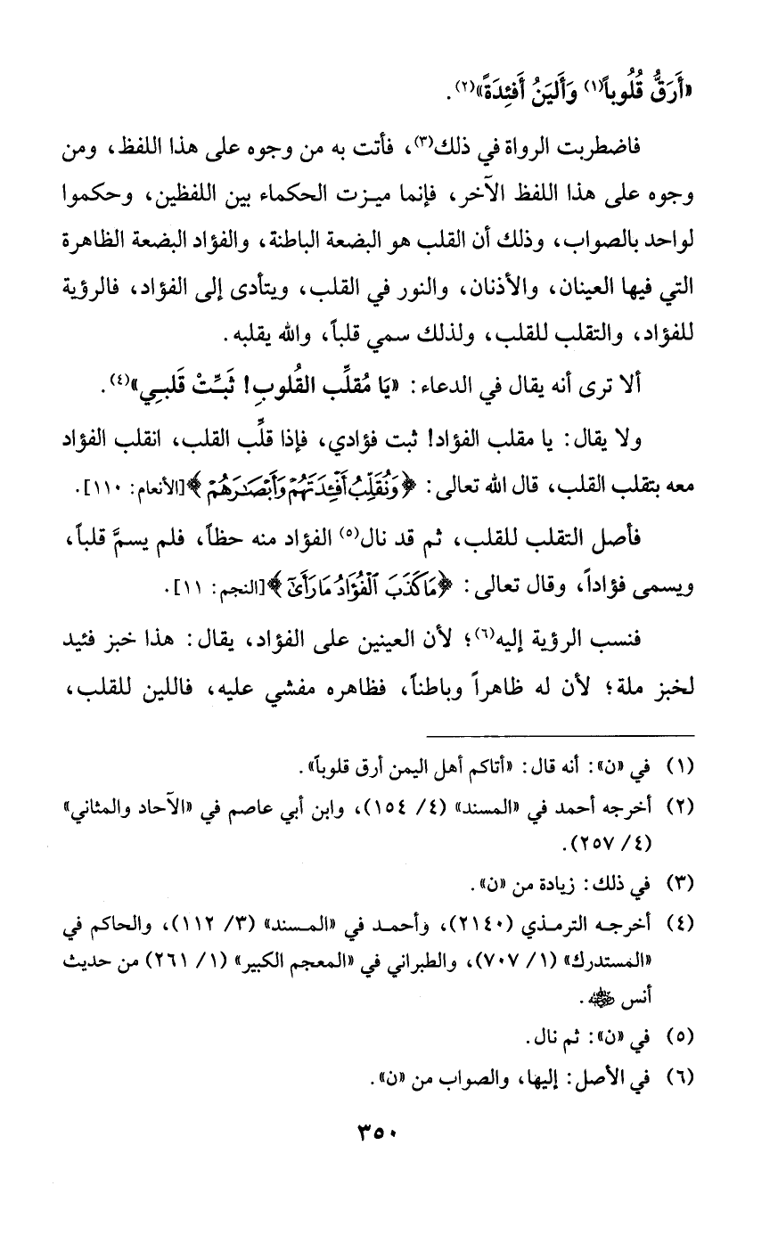 فاضطربت الرواة في ذلك، فأتت به من وجوه على هذا اللفظ، ومن وجوه على هذا اللفظ الآخر، فإنما ميزت الحكماء بين اللفظين، وحكموا لواحد بالصواب، وذلك أن القلب هو البضعة الباطنة، والفؤاد البضعة الظاهرة التي فيها العينان، والأذنان، والنور في القلب، ويتأدى إلى الفؤاد، فالرؤية للفؤاد، والتقلب للقلب، ولذلك سمي قلباً، والله يقلبه.