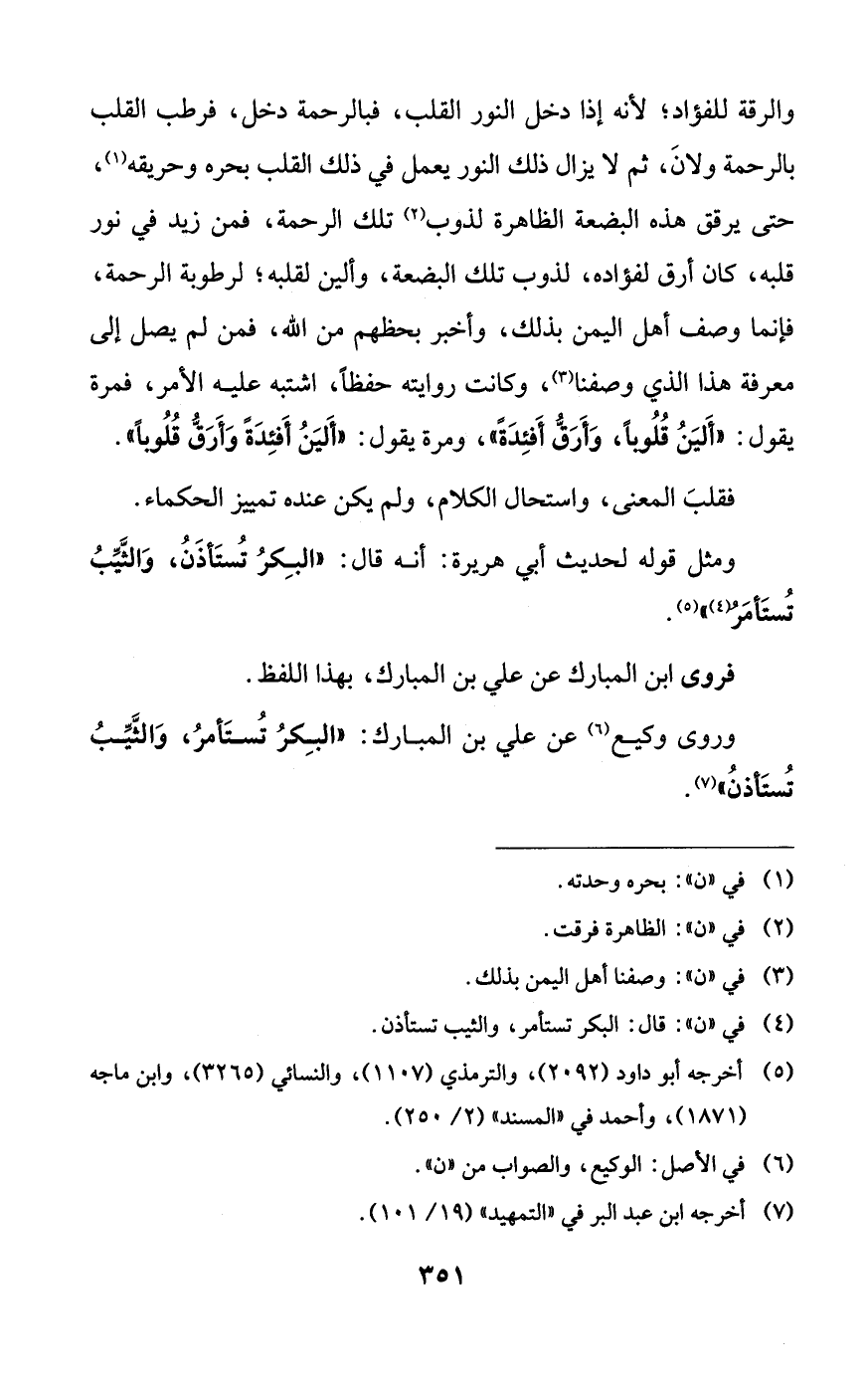 وروى وكيع عن علي بن المبارك: ((البكر تستأمر، والثيب تستأذن)).