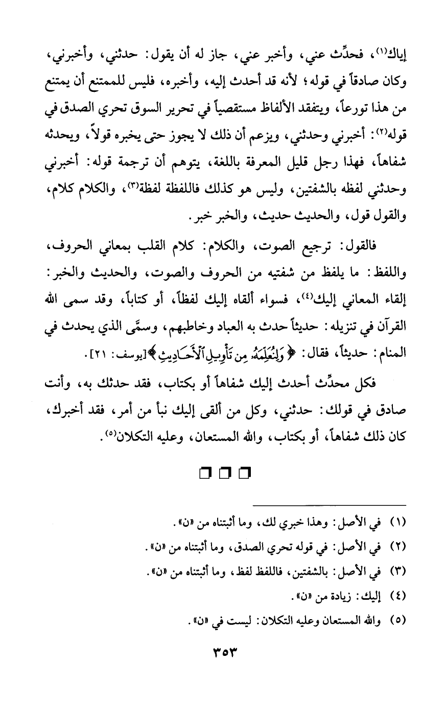 إياك، فحدث عني، وأخبر عني، جاز له أن يقول: حدثني، وأخبرني، وكان صادقاً في قوله؛ لأنه قد أحدث إليه، وأخبره، فليس للمتنع أن يمتنع من هذا تورعاً، ويتفقد الألفاظ مستقصياً في تحرير السوق تحري الصدق في قوله: أخبرني وحدثني، ويزعم أن ذلك لا يجوز حتى يخبره قولاً، ويحدثه شفاهاً، فهذا رجل قليل المعرفة باللغة، يتوهم أن ترجمة قوله: أخبرني وحدثني لفظه بالشفتين، وليس هو كذلك فاللفظة لفظة، والكلام كلام، والقول قول، والحديث حديث، والخبر خبر.