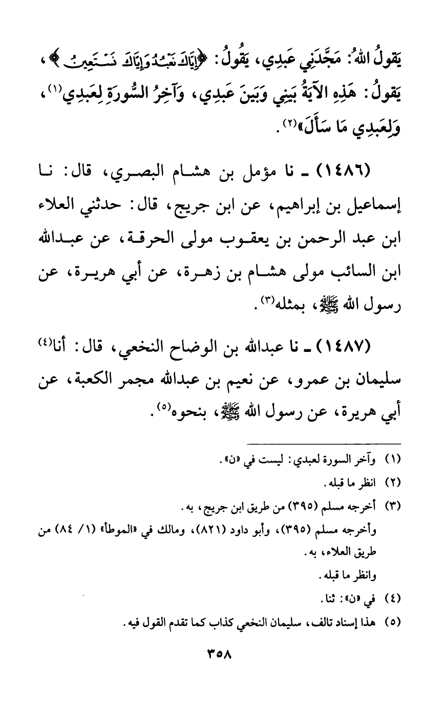 1486 - نا مؤمل بن هشام البصري، قال: نا إسماعيل بن إبراهيم، عن ابن جريج، قال: حدثني العلاء ابن عبد الرحمن بن يعقوب مولى الحرقة، عن عبد الله ابن السائب مولى هشام بن زهرة، عن أبي هريرة، عن رسول الله صلى الله عليه وسلم، بمثله.
