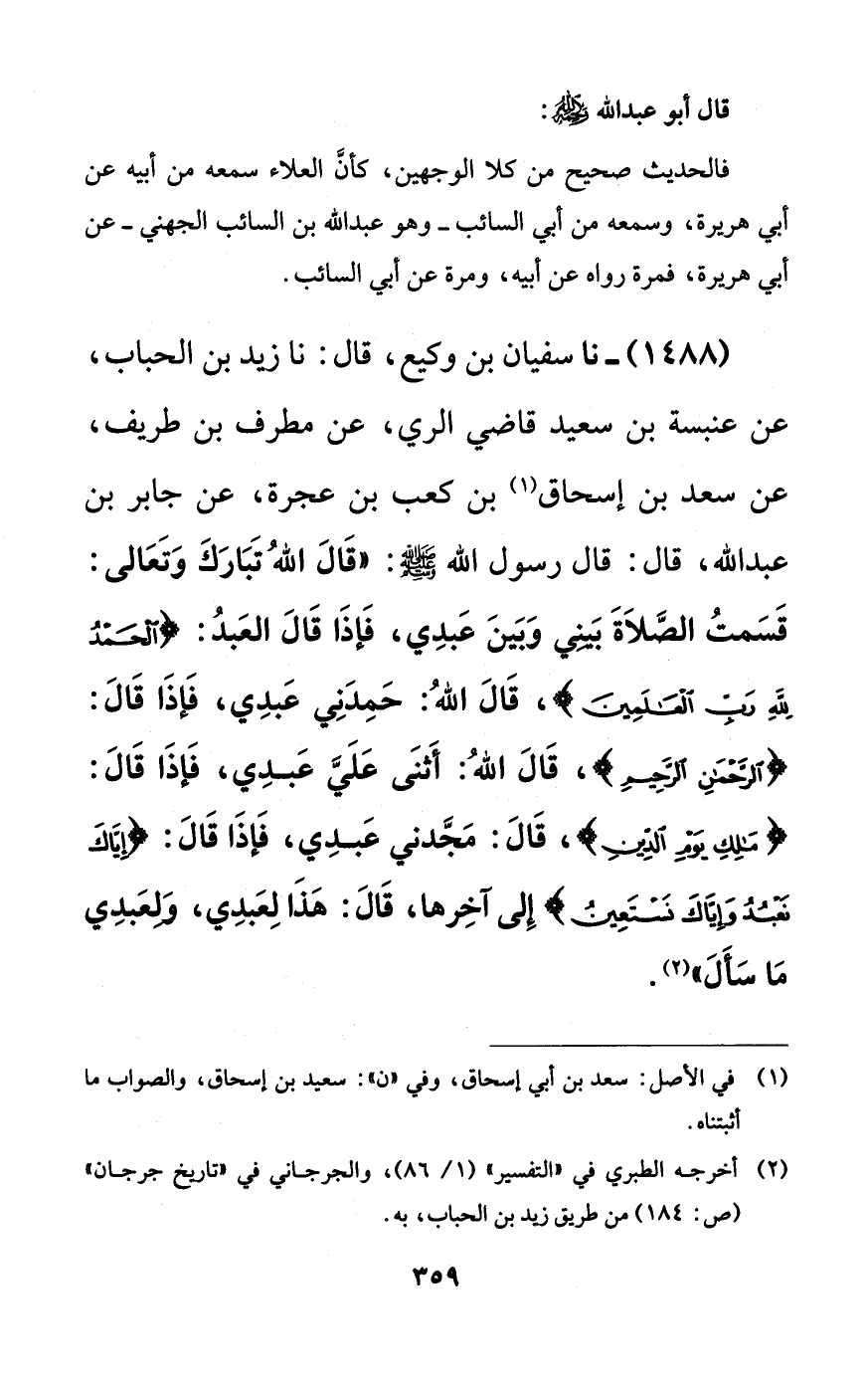 1488 - نا سفيان بن وكيع، قال: نا زيد بن الحباب، عن عنبسة بن سعيد قاضي الري، عن مطرف بن طريف، عن سعد بن إسحاق بن كعب بن عجرة، عن جابر بن عبد الله، قال: قال رسول الله صلى الله عليه وسلم: ((قال الله تبارك وتعالى: قسمت الصلاة بيني وبين عبدي، فإذا قال العبد: {الحمد لله رب العالمين}، قال الله: حمدني عبدي، فإذا قال: {الرحمن الرحيم}، قال الله: أثنى علي عبدي، فإذا قال: {مالك يوم الدين}، قال: مجدني عبدي، فإذا قال: {إياك نعبد وإياك نستعين} إلى آخرها، قال: هذا لعبدي، ولعبدي ما سأل)).