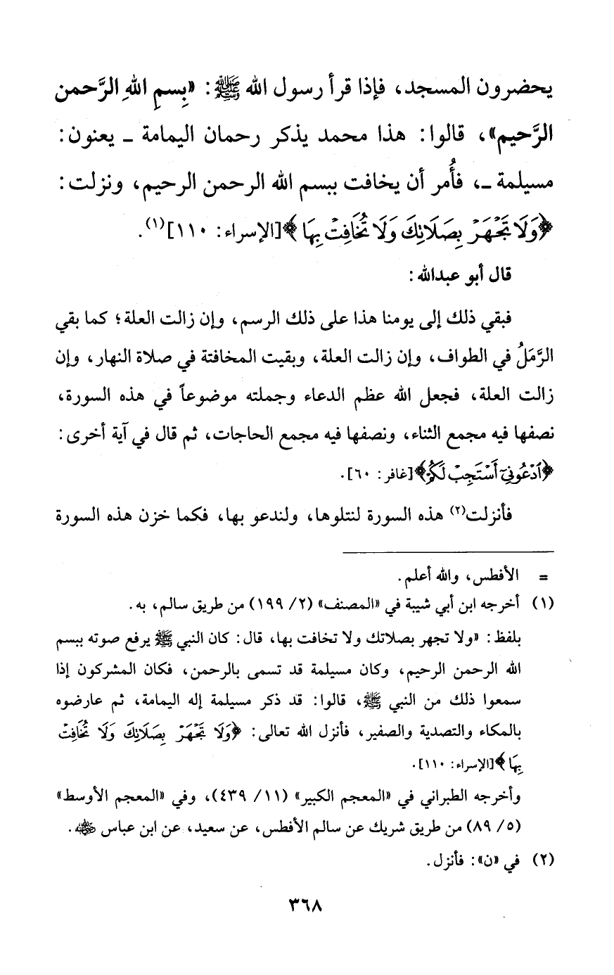 يحضرون المسجد، فإذا قرأ رسول الله صلى الله عليه وسلم: ((بسم الله الرحمن الرحيم))، قالوا: هذا محمد يذكر رحمان اليمامة -يعنون: مسيلمة-، فأمر أن يخافت ببسم الله الرحمن الرحيم، ونزلت: {ولا تجهر بصلاتك ولا تخافت بها}.