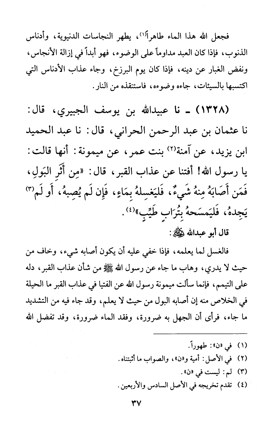 1328 - نا عبيد الله بن يوسف الجبيري، قال: نا عثمان بن عبد الرحمن الحراني، قال: نا عبد الحميد ابن يزيد، عن آمنة بنت عمر، عن ميمونة: أنها قالت: يا رسول الله! أفتنا عن عذاب القبر، قال: ((من أثر البول، فمن أصابه منه شيءٌ، فليغسله بماءٍ، فإن لم يصبه، أو لم يجده، فليمسحه بترابٍ طيبٍ)).