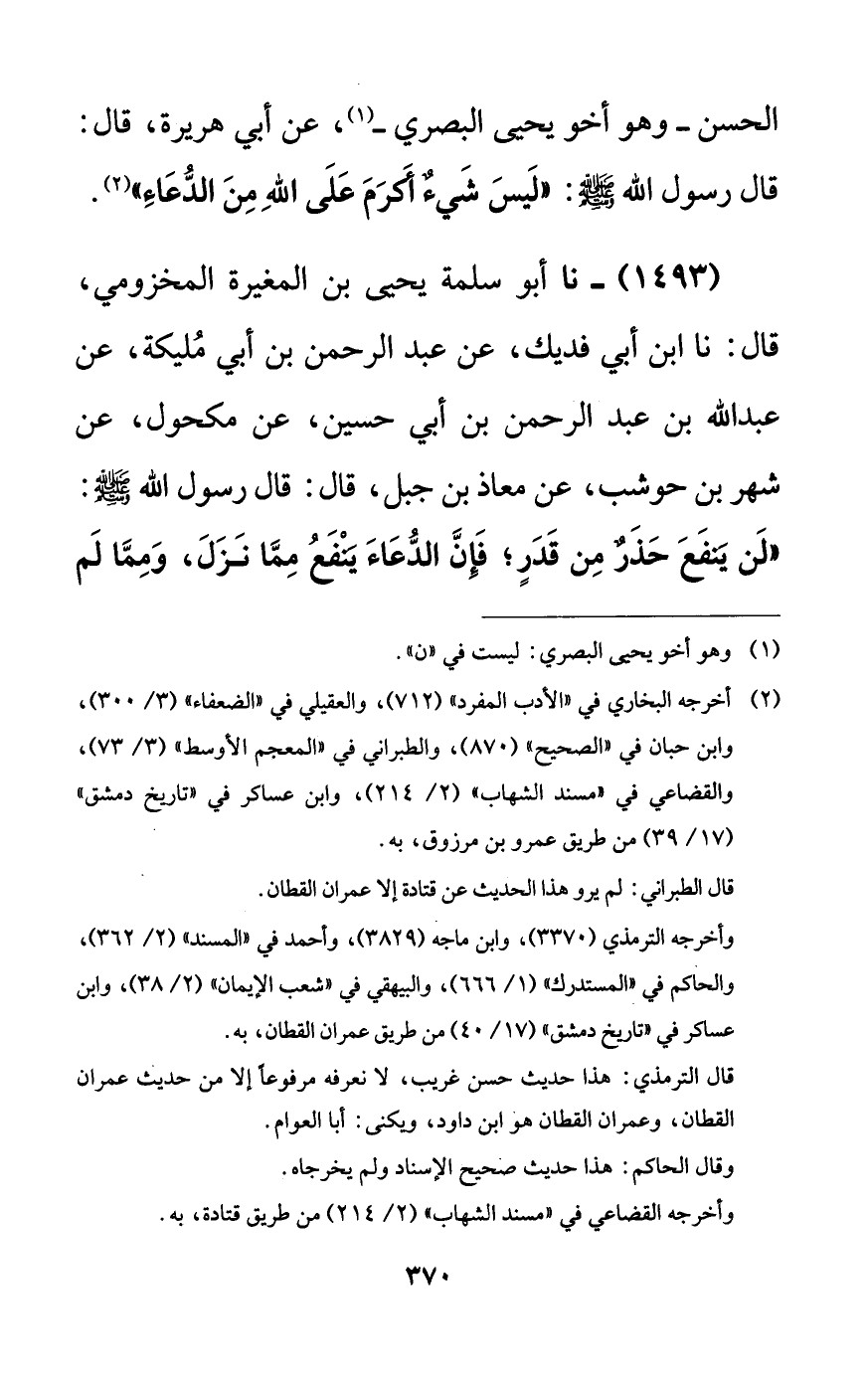 1493 - نا أبو سلمة يحيى بن المغيرة المخزومي، قال: نا ابن أبي فديك، عن عبد الرحمن بن أبي مليكة، عن عبد الله بن عبد الرحمن بن أبي حسين، عن مكحول، عن شهر بن حوشب، عن معاذ بن جبل، قال: قال رسول الله صلى الله عليه وسلم: ((لن ينفع حذرٌ من قدرٍ؛ فإن الدعاء ينفع مما نزل، ومما لم