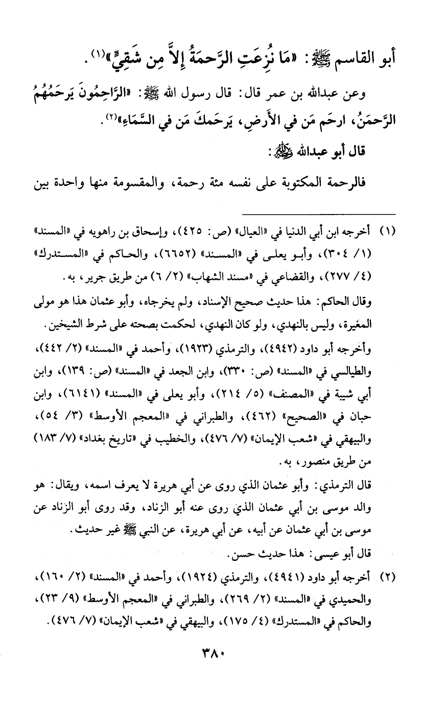 وعن عبد الله بن عمر قال: قال رسول الله صلى الله عليه وسلم: ((الراحمون يرحمهم الرحمن، ارحم من في الأرض، يرحمك من في السماء)).