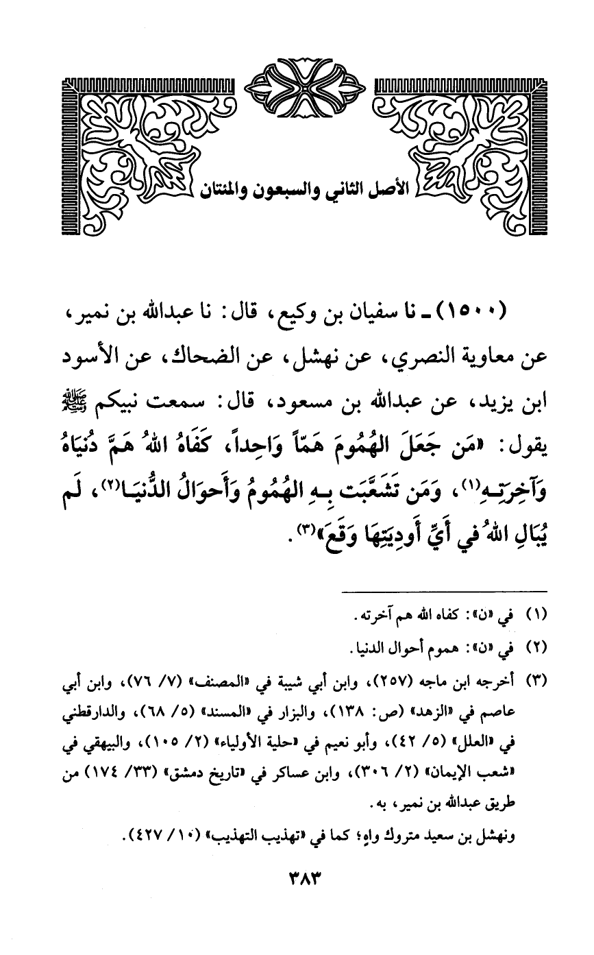 1500 - نا سفيان بن وكيع، قال: نا عبد الله بن نمير، عن معاوية النصري، عن نهشل، عن الضحاك، عن الأسود ابن يزيد، عن عبد الله بن مسعود، قال: سمعت نبيكم صلى الله عليه وسلم يقول: ((من جعل الهموم هماً واحداً، كفاه الله هم دنياه وآخرته، ومن تشعبت به الهموم وأحوال الدنيا، لم يبال الله في أي أوديتها وقع)).