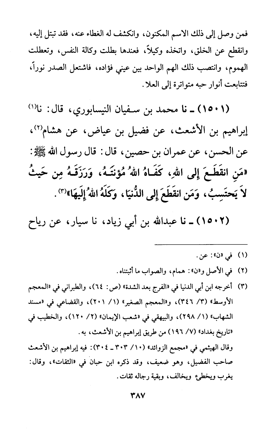 1501 - نا محمد بن سفيان النيسابوري، قال: نا إبراهيم بن الأشعث، عن فضيل بن عياض، عن هشام، عن الحسن، عن عمران بن حصين، قال: قال رسول الله صلى الله عليه وسلم: ((من انقطع إلى الله، كفاه الله مؤنته، ورزقه من حيث لا يحتسب، ومن انقطع إلى الدنيا، وكله الله إليها)).