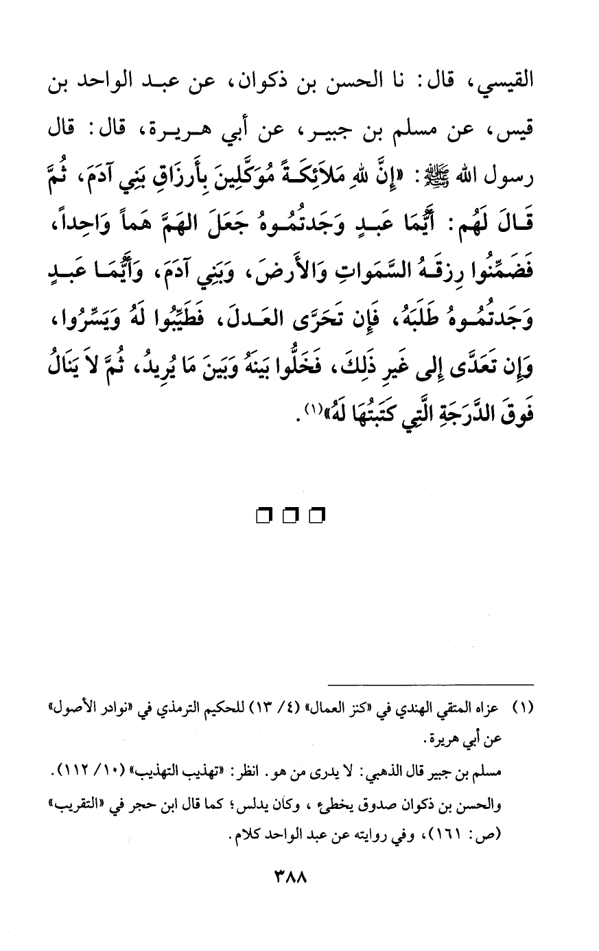 القيسي، قال: نا الحسن بن ذكوان، عن عبد الواحد بن قيس، عن مسلم بن جبير، عن أبي هريرة، قال: قال رسول الله صلى الله عليه وسلم: ((إن لله ملائكة موكلين بأرزاق بني آدم، ثم قال لهم: أيما عبدٍ وجدتموه جعل الهم هماً واحداً، فضمنوا رزقه السماوات والأرض، وبني آدم، وأيما عبدٍ وجدتموه طلبه، فإن تحرى العدل، فطيبوا له ويسروا، وإن تعدى إلى غير ذلك، فخلوا بينه وبين ما يريد، ثم لا ينال فوق الدرجة التي كتبتها له)).