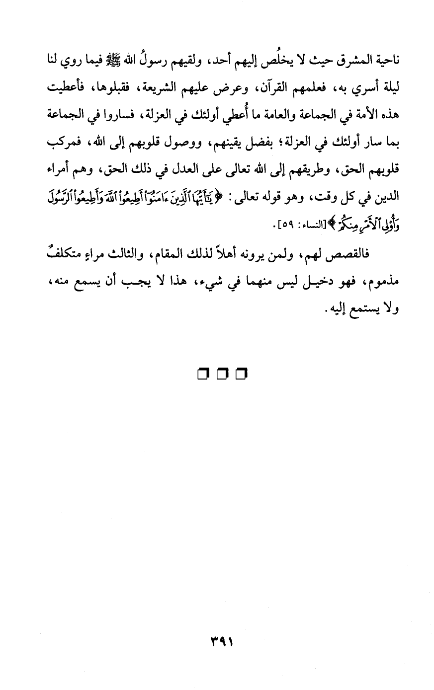 ناحية المشرق حيث لا يخلص إليهم أحد، ولقيهم رسول الله صلى الله عليه وسلم فيما روي لنا ليلة أسري به، فعلمهم القرآن، وعرض عليهم الشريعة، فقبلوها، فأعطيت هذه الأمة في الجماعة والعامة ما أعطي أولئك في العزلة، فساروا في الجماعة بما سار أولئك في العزلة؛ بفضل يقينهم، ووصول قلوبهم إلى الله، فمركب قلوبهم الحق، وطريقهم إلى الله تعالى على العدل في ذلك الحق، وهم أمراء الدين في كل وقت، وهو قوله تعالى: {يأيها الذين آمنوا أطيعوا الله وأطيعوا الرسول وأولى الأمر منكم}.