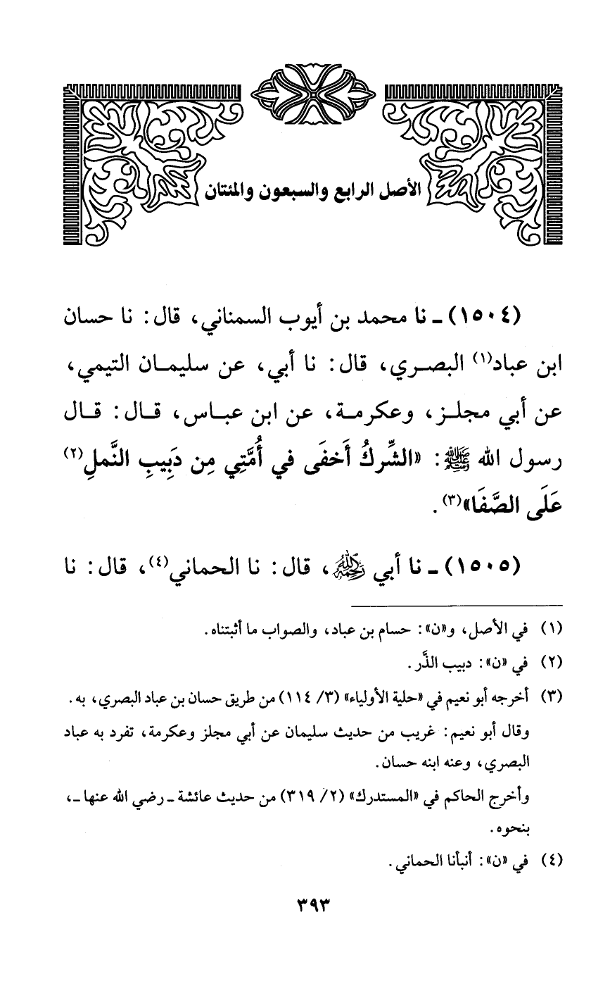 1504 - نا محمد بن أيوب السمناني، قال: نا حسان ابن عباد البصري، قال: نا أبي، عن سليمان التيمي، عن أبي مجلز، وعكرمة، عن ابن عباس، قال: قال رسول الله صلى الله عليه وسلم: ((الشرك أخفى في أمتي من دبيب النمل على الصفا)).
