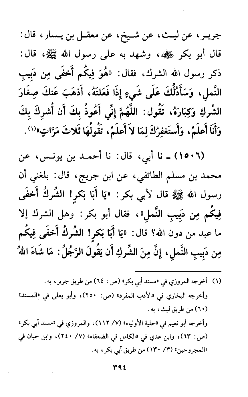 1506 - نا أبي، قال: نا أحمد بن يونس، عن محمد بن مسلم الطائفي، عن ابن جريج، قال: بلغني أن رسول الله صلى الله عليه وسلم قال لأبي بكر: ((يا أبا بكرٍ! الشرك أخفى فيكم من دبيب النمل))، فقال أبو بكر: وهل الشرك إلا ما عبد من دون الله؟ قال: ((يا أبا بكرٍ! الشرك أخفى فيكم من دبيب النمل، إن من الشرك أن يقول الرجل: ما شاء الله
