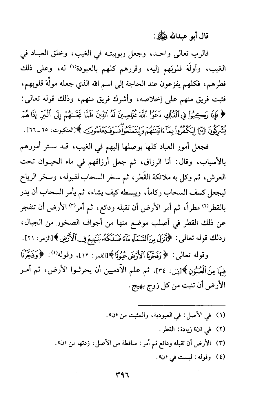 فالرب تعالى واحد، وجعل ربوبيته في الغيب، وخلق العباد في الغيب، وأوله قلوبهم إليه، وقررهم كلهم بالعبودة له، وعلى ذلك فطرهم، فكلهم يفزعون عند الحاجة إلى اسم الله الذي جعله موله قلوبهم، فثبت فريق منهم على إخلاصه، وأشرك فريق منهم، وذلك قوله تعالى: {فإذا ركبوا في الفلك دعوا الله مخلصين له الدين فلما نجاهم إلى البر إذا هم يشركون. ليكفروا بما آتيناهم وليتمتعوا فسوف يعلمون}.