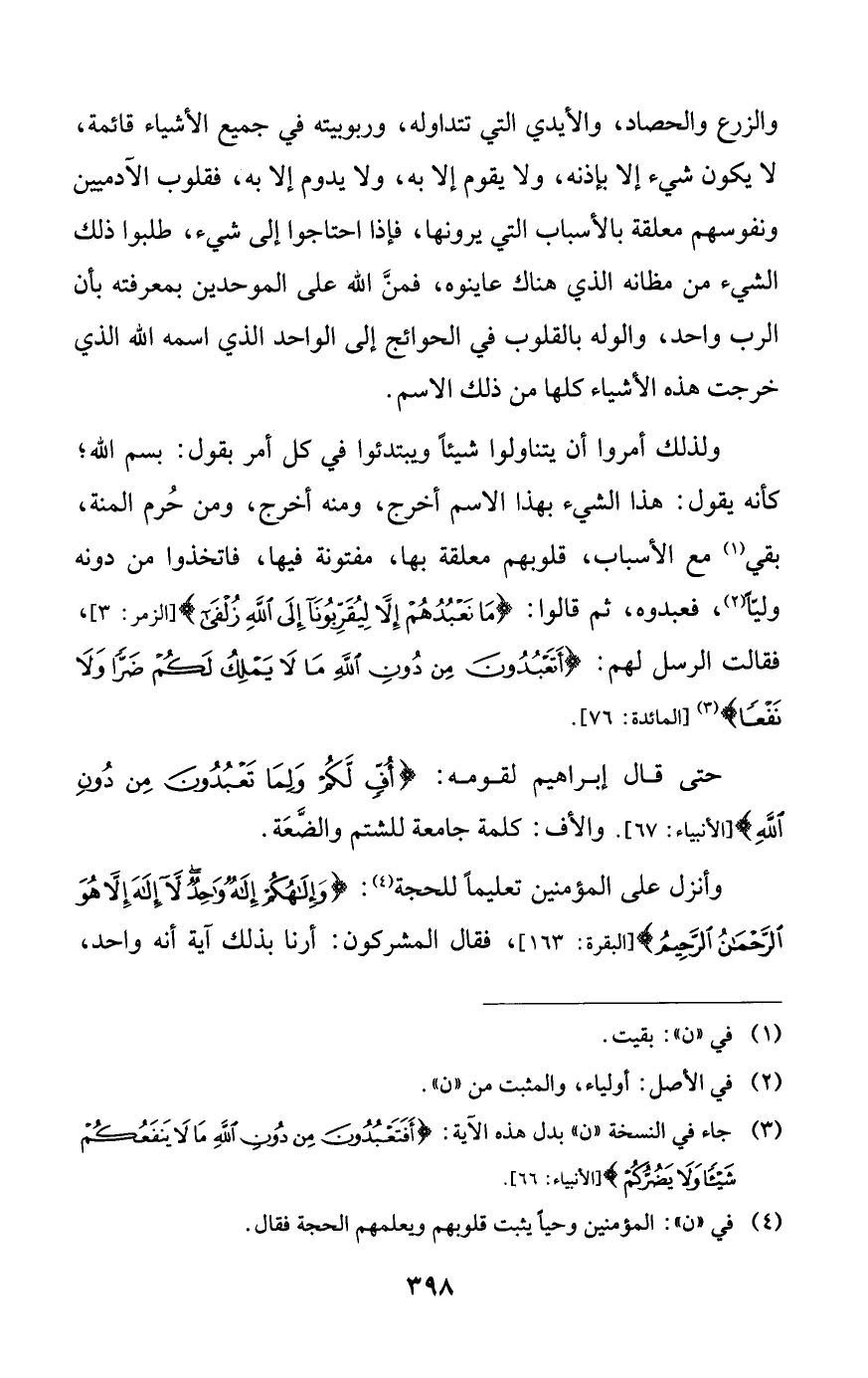ولذلك أمروا أن يتناولوا شيئاً ويبتدئوا في كل أمر بقول: بسم الله؛ كأنه يقول: هذا الشيء بهذا الاسم أخرج، ومنه أخرج، ومن حرم المنة، بقي مع الأسباب، قلوبهم معلقة بها، مفتونة فيها، فاتخذوا من دونه ولياً، فعبدوه، ثم قالوا: {ما نعبدهم إلا ليقربونا إلى الله زلفى}، فقالت الرسل لهم: {أتعبدون من دون الله ما لا يملك لكم ضراً ولا نفعاً}.
