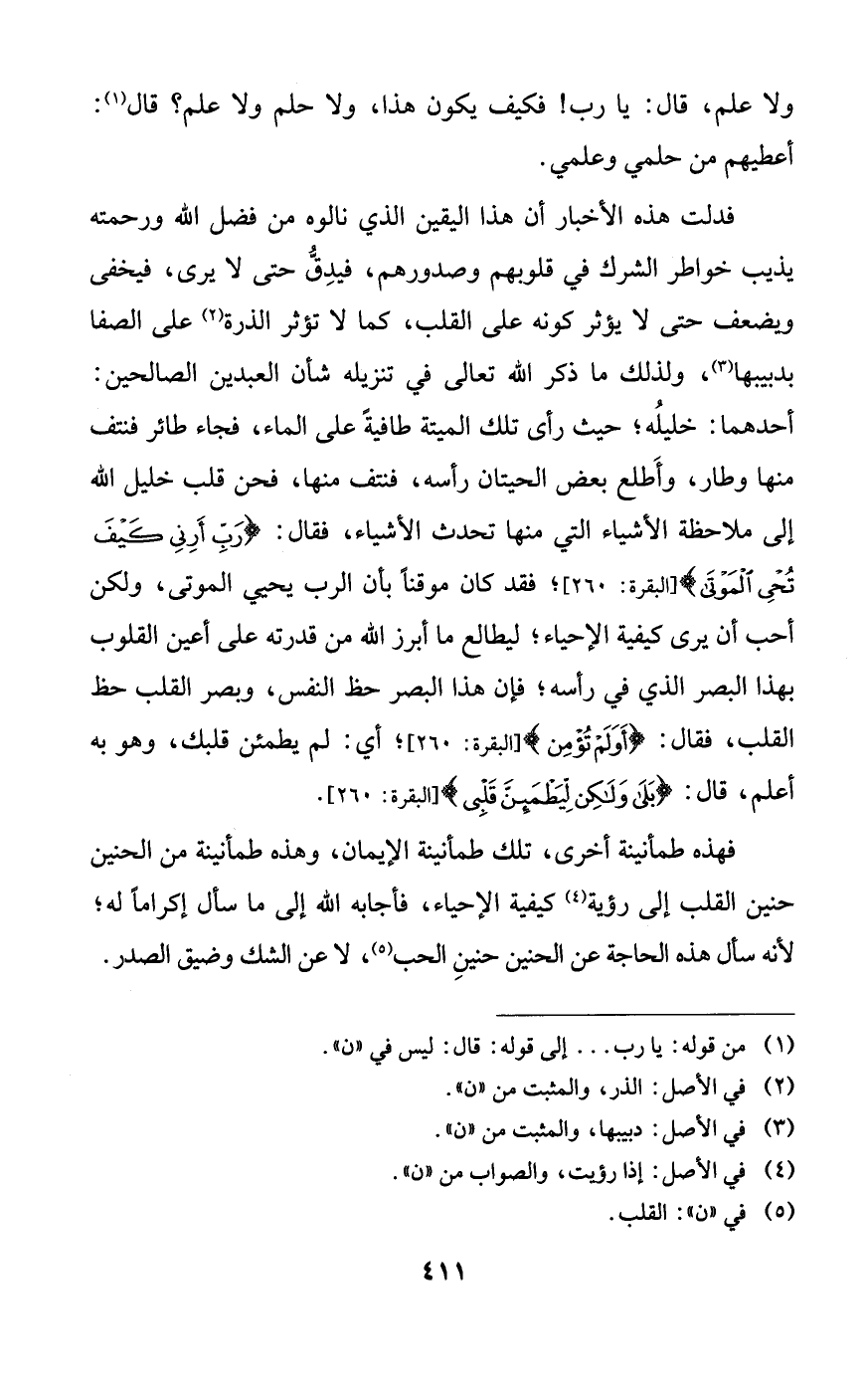 فدلت هذه الأخبار أن هذا اليقين الذي نالوه من فضل الله ورحمته يذيب خواطر الشرك في قلوبهم وصدورهم، فيدق حتى لا يرى، فيخفى ويضعف حتى لا يؤثر كونه على القلب، كما لا تؤثر الذرة على الصفا بدبيبها، ولذلك ما ذكر الله تعالى في تنزيله شأن العبدين الصالحين: أحدهما: خليله؛ حيث رأى تلك الميتة طافيةً على الماء، فجاء طائر فنتف منها وطار، وأطلع بعض الحيتان رأسه، فنتف منها، فحن قلب خليل الله إلى ملاحظة الأشياء التي منها تحدث الأشياء، فقال: {رب أرني كيف تحيي الموتى}؛ فقد كان موقناً بأن الرب يحيي الموتى، ولكن أحب أن يرى كيفية الإحياء؛ ليطالع ما أبرز الله من قدرته على أعين القلوب بهذا البصر الذي في رأسه؛ فإن هذا البصر حظ النفس، وبصر القلب حظ القلب، فقال: {أولم تؤمن}؛ أي: لم يطمئن قلبك، وهو به أعلم، قال: {بلى ولكن ليطمئن قلبي}.