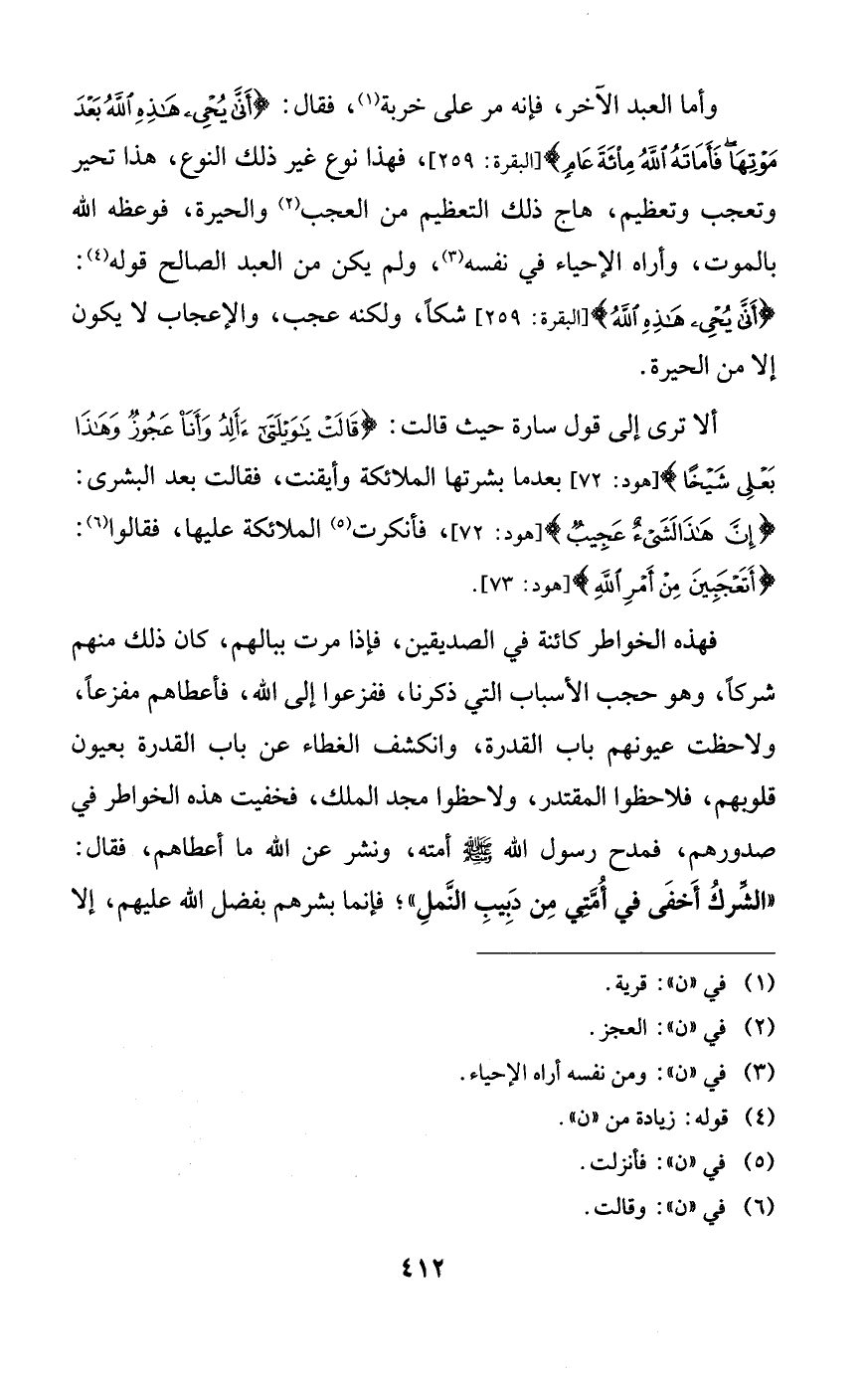 وأما العبد الآخر، فإنه مر على خربة، فقال: {أنى يحيي هذه الله بعد موتها فأماته الله مائة عامٍ}، فهذا نوع غير ذلك النوع، هذا تحير وتعجب وتعظيم، هاج ذلك التعظيم من العجب والحيرة، فوعظه الله بالموت، وأراه الإحياء في نفسه، ولم يكن من العبد الصالح قوله: {أنى يحيى هذه الله} شكاً، ولكنه عجب، والإعجاب لا يكون إلا من الحيرة.