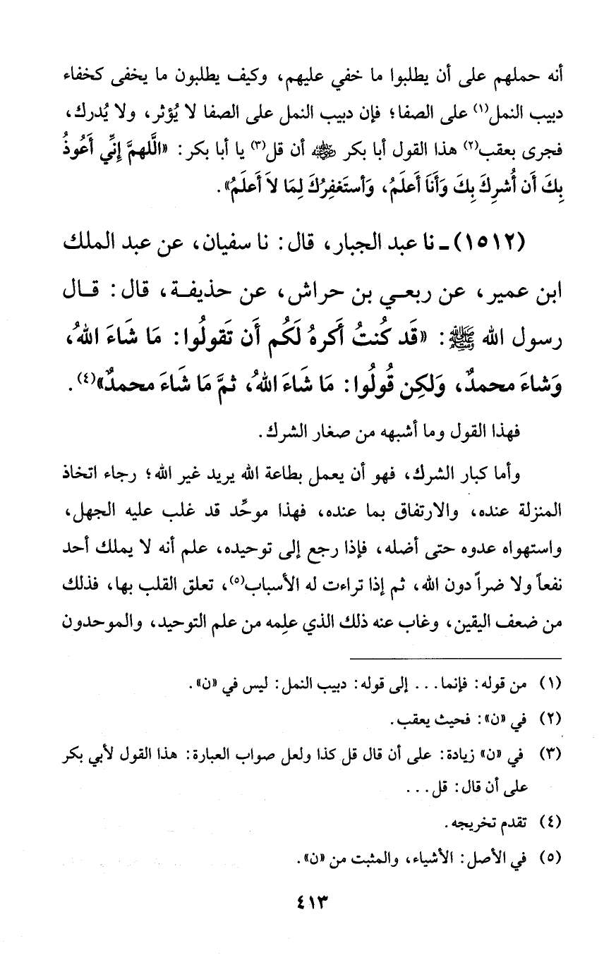 1512 - نا عبد الجبار، قال: نا سفيان، عن عبد الملك ابن عمير، عن ربعي بن حراش، عن حذيفة، قال: قال رسول الله صلى الله عليه وسلم: ((قد كنت أكره لكم أن تقولوا: ما شاء الله، وشاء محمدٌ، ولكن قولوا: ما شاء الله، ثم ما شاء محمدٌ)).