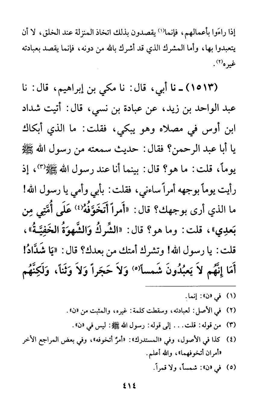 1513 - نا أبي، قال: نا مكي بن إبراهيم، قال: نا عبد الواحد بن زيد، عن عبادة بن نسي، قال: أتيت شداد ابن أوس في مصلاه وهو يبكي، فقلت: ما الذي أبكاك يا أبا عبد الرحمن؟ فقال: حديث سمعته من رسول الله صلى الله عليه وسلم يوماً، قلت: ما هو؟ قال: بينما أنا عند رسول الله صلى الله عليه وسلم، إذ رأيت يوماً بوجهه أمراً ساءني، فقلت: بأبي وأمي يا رسول الله! ما الذي أرى بوجهك؟ قال: ((أمراً أتخوفه على أمتي من بعدي))، قلت: وما هو؟ قال: ((الشرك والشهوة الخفية))، قلت: يا رسول الله! وتشرك أمتك من بعدك؟ قال: ((يا شداد! أما إنهم لا يعبدون شمساً ولا حجراً ولا وثناً، ولكنهم