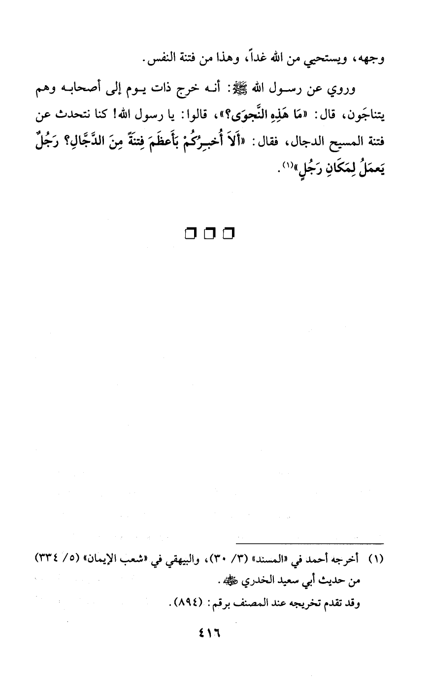 وروي عن رسول الله صلى الله عليه وسلم: أنه خرج ذات يوم إلى أصحابه وهم يتناجون، قال: ((ما هذه النجوى؟))، قالوا: يا رسول الله! كنا نتحدث عن فتنة المسيح الدجال، فقال: ((ألا أخبركم بأعظم فتنةً من الدجال؟ رجلٌ يعمل لمكان رجلٍ)).