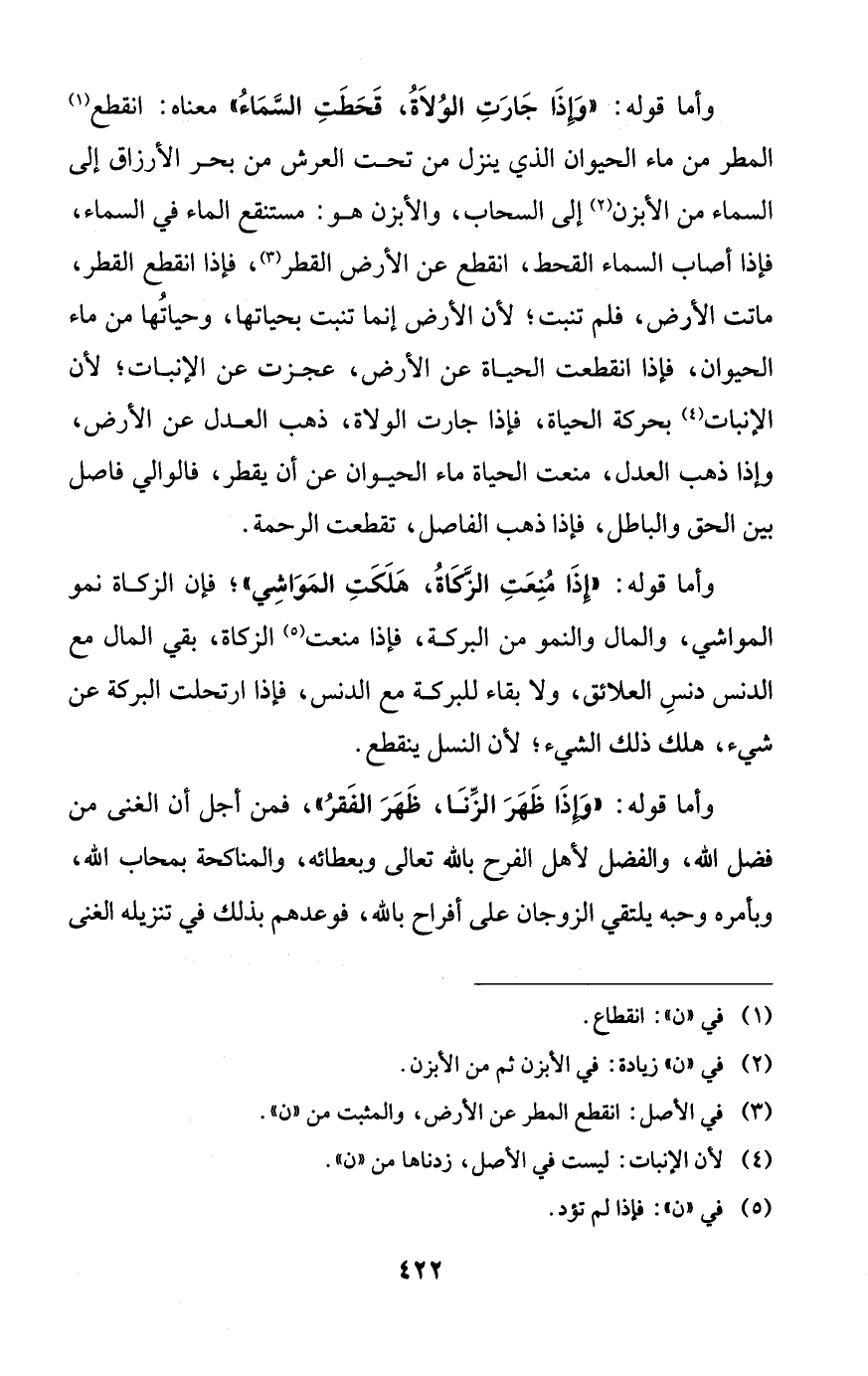 وأما قوله: ((وإذا جارت الولاة، قحطت السماء)) معناه: انقطع المطر من ماء الحيوان الذي ينزل من تحت العرش من بحر الأرزاق إلى السماء من الأبزن إلى السحاب، والأبزن هو: مستنقع الماء في السماء، فإذا أصاب السماء القحط، انقطع عن الأرض القطر، فإذا انقطع القطر، ماتت الأرض، فلم تنبت؛ لأن الأرض إنما تنبت بحياتها، وحياتها من ماء الحيوان، فإذا انقطعت الحياة عن الأرض، عجزت عن الإنبات؛ لأن الإنبات بحركة الحياة، فإذا جارت الولاة، ذهب العدل عن الأرض، وإذا ذهب العدل، منعت الحياة ماء الحيوان عن أن يقطر، فالوالي فاصل بين الحق والباطل، فإذا ذهب الفاصل، تقطعت الرحمة.