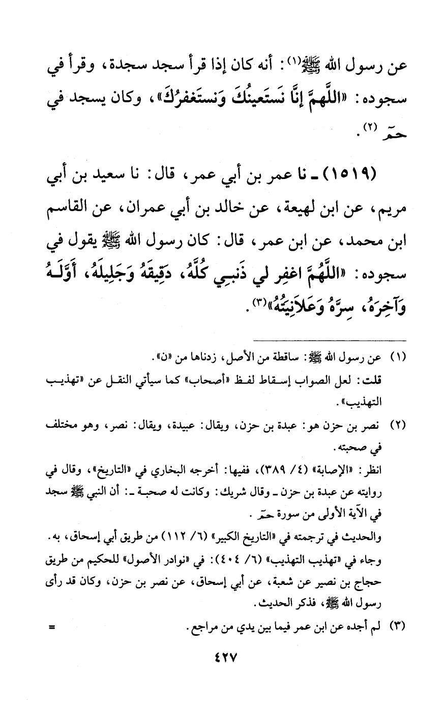 1519 - نا عمر بن أبي عمر، قال: نا سعيد بن أبي مريم، عن ابن لهيعة، عن خالد بن أبي عمران، عن القاسم ابن محمد، عن ابن عمر، قال: كان رسول الله صلى الله عليه وسلم يقول في سجوده: ((اللهم اغفر لي ذنبي كله، دقيقه وجليله، أوله وآخره، سره وعلانيته)).