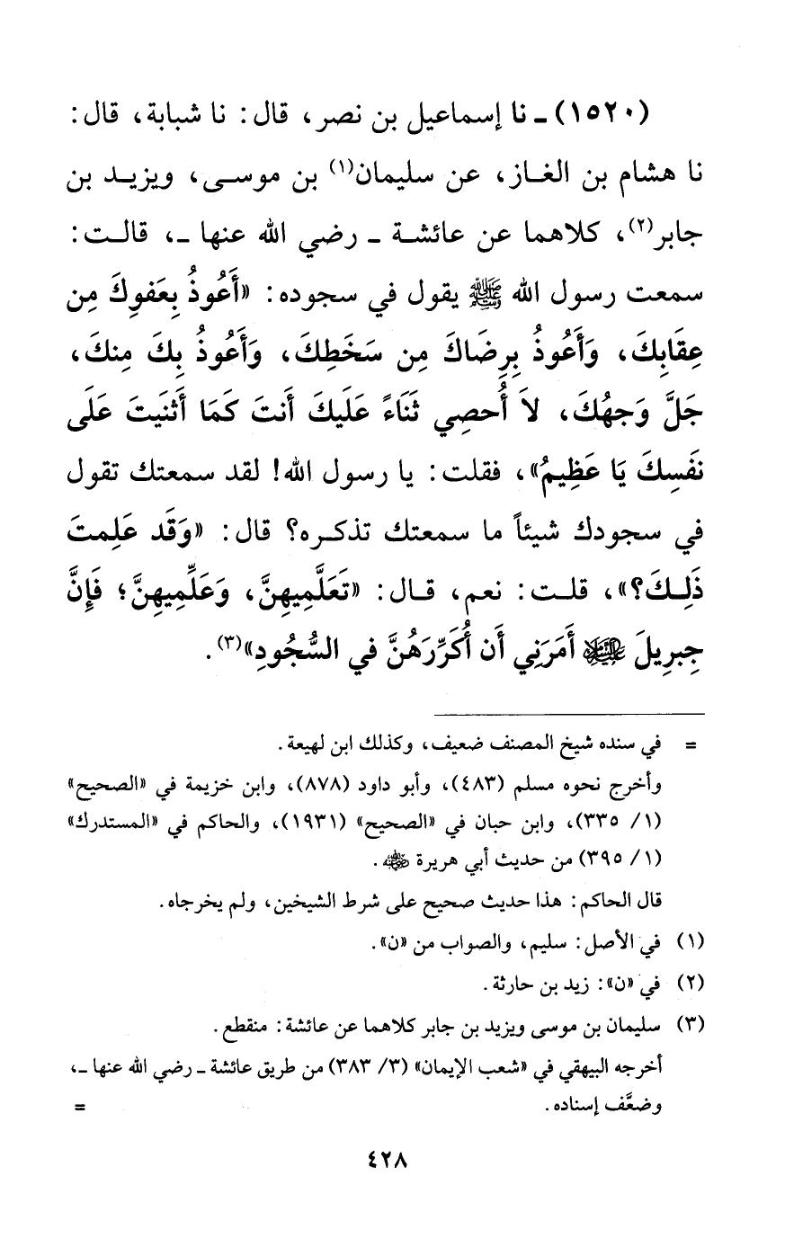 1520 - نا إسماعيل بن نصر، قال: نا شبابة، قال: نا هشام بن الغاز، عن سليمان بن موسى، ويزيد بن جابر، كلاهما عن عائشة -رضي الله عنها-، قالت: سمعت رسول الله صلى الله عليه وسلم يقول في سجوده: ((أعوذ بعفوك من عقابك، وأعوذ برضاك من سخطك، وأعوذ بك منك، جل وجهك، لا أحصي ثناءً عليك أنت كما أثنيت على نفسك يا عظيم))، فقلت: يا رسول الله! لقد سمعتك تقول في سجودك شيئاً ما سمعتك تذكره؟ قال: ((وقد علمت ذلك؟))، قلت: نعم، قال: ((تعلميهن، وعلميهن؛ فإن جبريل عليه السلام أمرني أن أكررهن في السجود)).