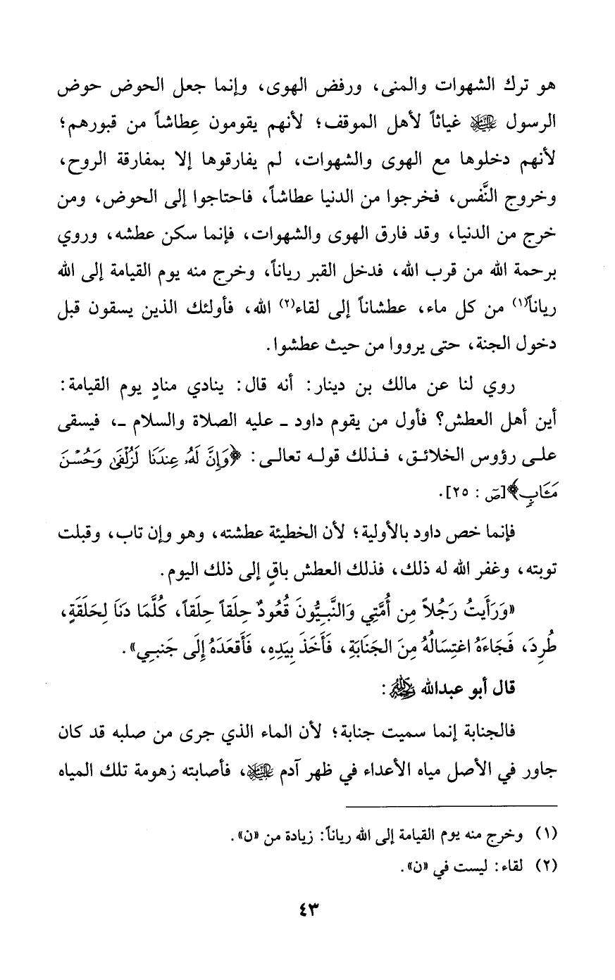 هو ترك الشهوات والمنى، ورفض الهوى، وإنما جعل الحوض حوض الرسول عليه السلام غياثاً لأهل الموقف؛ لأنهم يقومون عطاشاً من قبورهم؛ لأنهم دخلوها مع الهوى والشهوات، لم يفارقوها إلا بمفارقة الروح، وخروج النفس، فخرجوا من الدنيا عطاشاً، فاحتاجوا إلى الحوض، ومن خرج من الدنيا، وقد فارق الهوى والشهوات، فإنما سكن عطشه، وروي برحمة الله من قرب الله، فدخل القبر رياناً، وخرج منه يوم القيامة إلى الله رياناً من كل ماء، عطشاناً إلى لقاء الله، فأولئك الذين يسقون قبل دخول الجنة، حتى يرووا من حيث عطشوا.