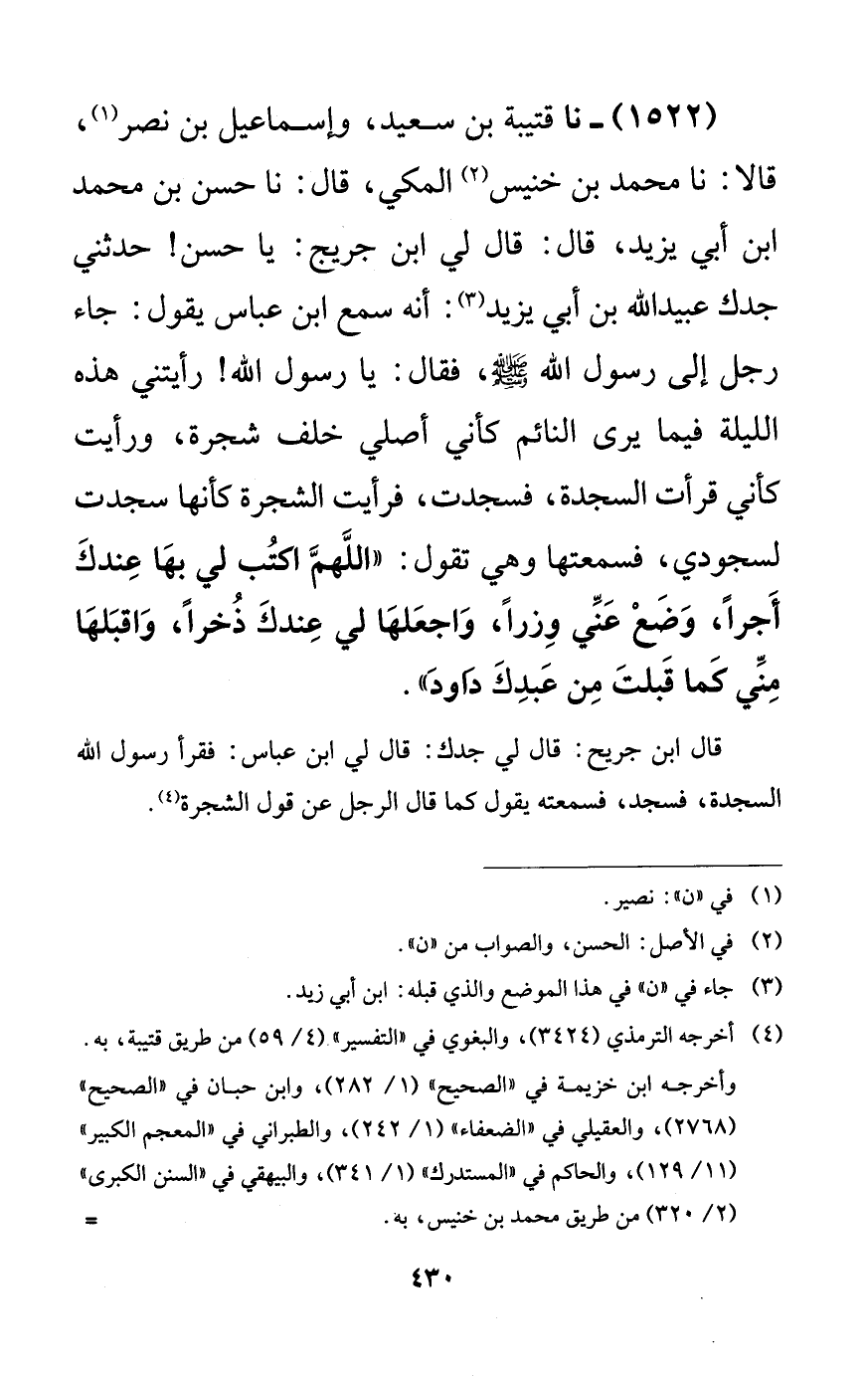 1522 - نا قتيبة بن سعيد، وإسماعيل بن نصر، قالا: نا محمد بن خنيس المكي، قال: نا حسن بن محمد ابن أبي يزيد، قال: قال لي ابن جريج: يا حسن! حدثني جدك عبيد الله بن أبي يزيد: أنه سمع ابن عباس يقول: جاء رجل إلى رسول الله صلى الله عليه وسلم، فقال: يا رسول الله! رأيتني هذه الليلة فيما يرى النائم كأني أصلي خلف شجرة، ورأيت كأني قرأت السجدة، فسجدت، فرأيت الشجرة كأنها سجدت لسجودي، فسمعتها وهي تقول: ((اللهم اكتب لي بهذا عندك أجراً، وضع عني وزراً، واجعلها لي عندك ذخراً، واقبلها مني كما قبلت من عبدك داود)).