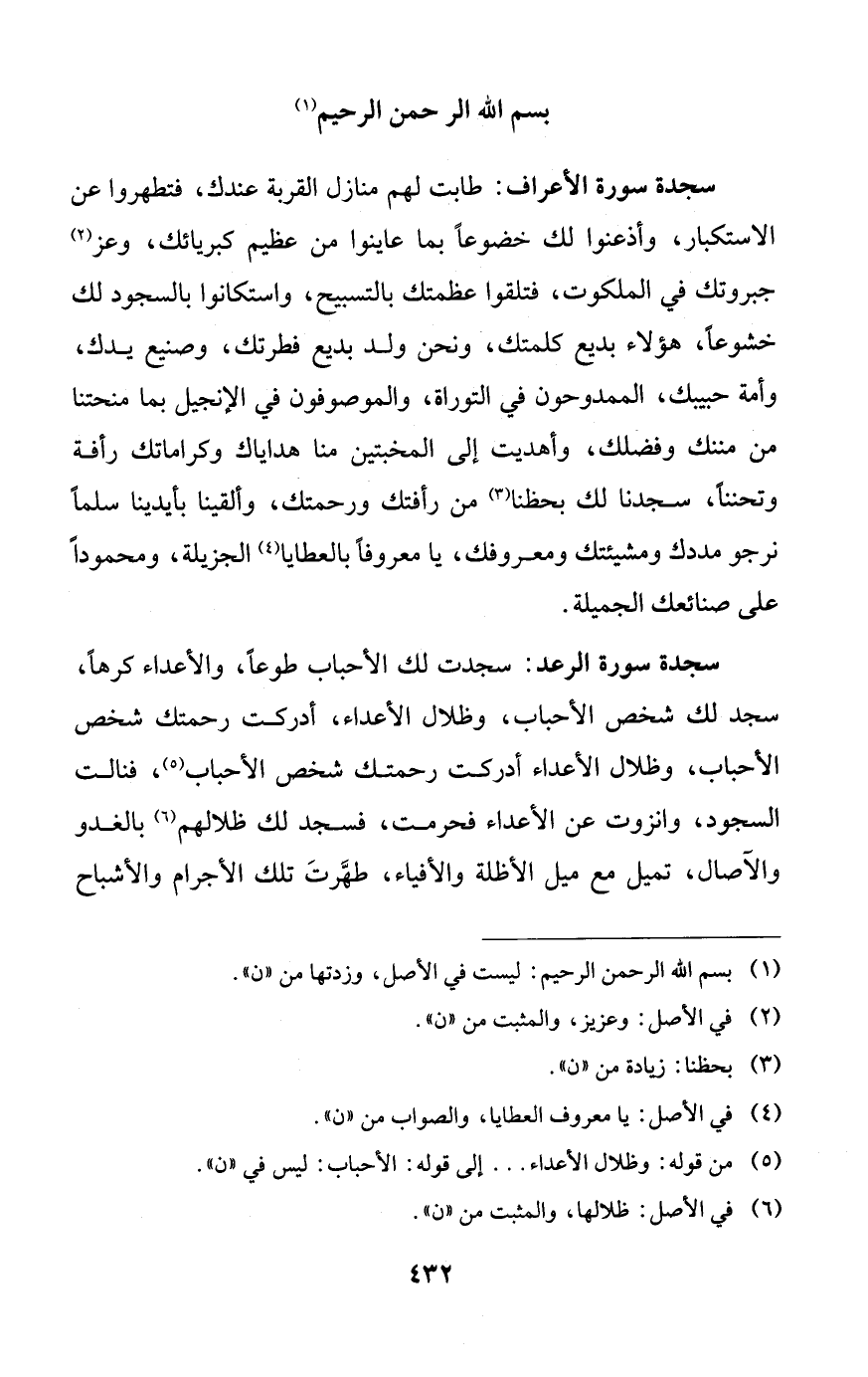 سجدة سورة الرعد: سجدت لك الأحباب طوعاً، والأعداء كرهاً، سجد لك شخص الأحباب، وظلال الأعداء، أدركت رحمتك شخص الأحباب، وظلال الأعداء أدركت رحمتك شخص الأحباب، فنالت السجود، وانزوت عن الأعداء فحرمت، فسجد لك ظلالهم بالغدو والآصال، تميل مع ميل الأظلة والأفياء، طهرت تلك الأجرام والأشباح