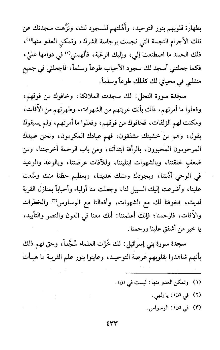 سجدة سورة النحل: لك سجدت الملائكة، وخافوك من فوقهم، وفعلوا ما أمرتهم، ذلك بأنك عريتهم من الشهوات، وطهرتهم من الآفات، ومكنت لهم الزلفات، فخافوك من فوقهم، وفعلوا ما أمرتهم، ولم يسبقوك بقول: وهم من خشيتك مشفقون، فهم عبادك المكرمون، ونحن عبيدك المرحومون المحبوون، بالرأفة ابتدأتنا، ومن باب الرحمة أخرجتنا، ومن ضعفٍ خلقتنا، وبالشهوات ابتليتنا، وللآفات عرضتنا، وبالوعد والوعيد في الوحي أدبتنا، وبجودك ومننك هديتنا، وبعظيم حظنا منك وسعت علينا، وأشرعت إليك السبيل لنا، وجعلت منا أولياء وأحباباً بمنازل القربة لديك، فخوفنا لك مع الشهوات، وأفعالنا مع الوساوس والخطرات والآفات، فارحمنا؛ فإنك أعلمتنا: أنك معنا في العون والنصر والتأييد، يا خير من أشفق علينا ورحمنا.