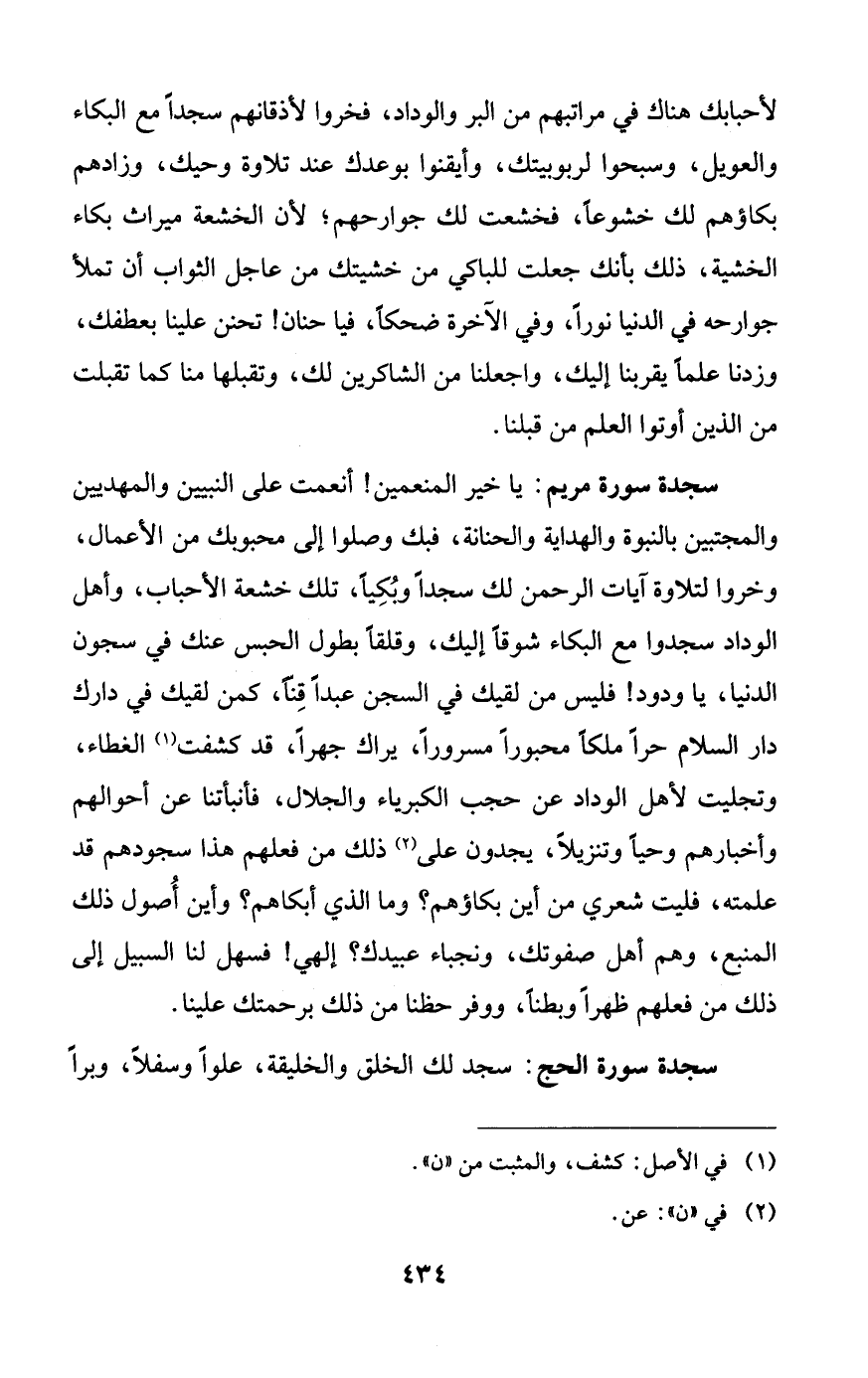 سجدة سورة مريم: يا خير المنعمين! أنعمت على النبيين والمهديين والمجتبين بالنبوة والهداية والحنانة، فبك وصلوا إلى محبوبك من الأعمال، وخروا لتلاوة آيات الرحمن لك سجداً وبكياً، تلك خشعة الأحباب، وأهل الوداد سجدوا مع البكاء شوقاً إليك، وقلقاً بطول الحبس عنك في سجون الدنيا، يا ودود! فليس من لقيك في السجن عبداً قناً، كمن لقيك في دارك دار السلام حراً ملكاً محبوراً مسروراً، يراك جهراً، قد كشفت الغطاء، وتجليت لأهل الوداد عن حجب الكبرياء والجلال، فأنبأتنا عن أحوالهم وأخبارهم وحياً وتنزيلاً، يجدون على ذلك من فعلهم هذا سجودهم قد علمته، فليت شعري من أين بكاؤهم؟ وما الذي أبكاهم؟ وأين أصول ذلك المنبع، وهم أهل صفوتك، ونجباء عبيدك؟ إلهي! فسهل لنا السبيل إلى ذلك من فعلهم ظهراً وبطناً، ووفر حظنا من ذلك برحمتك علينا.