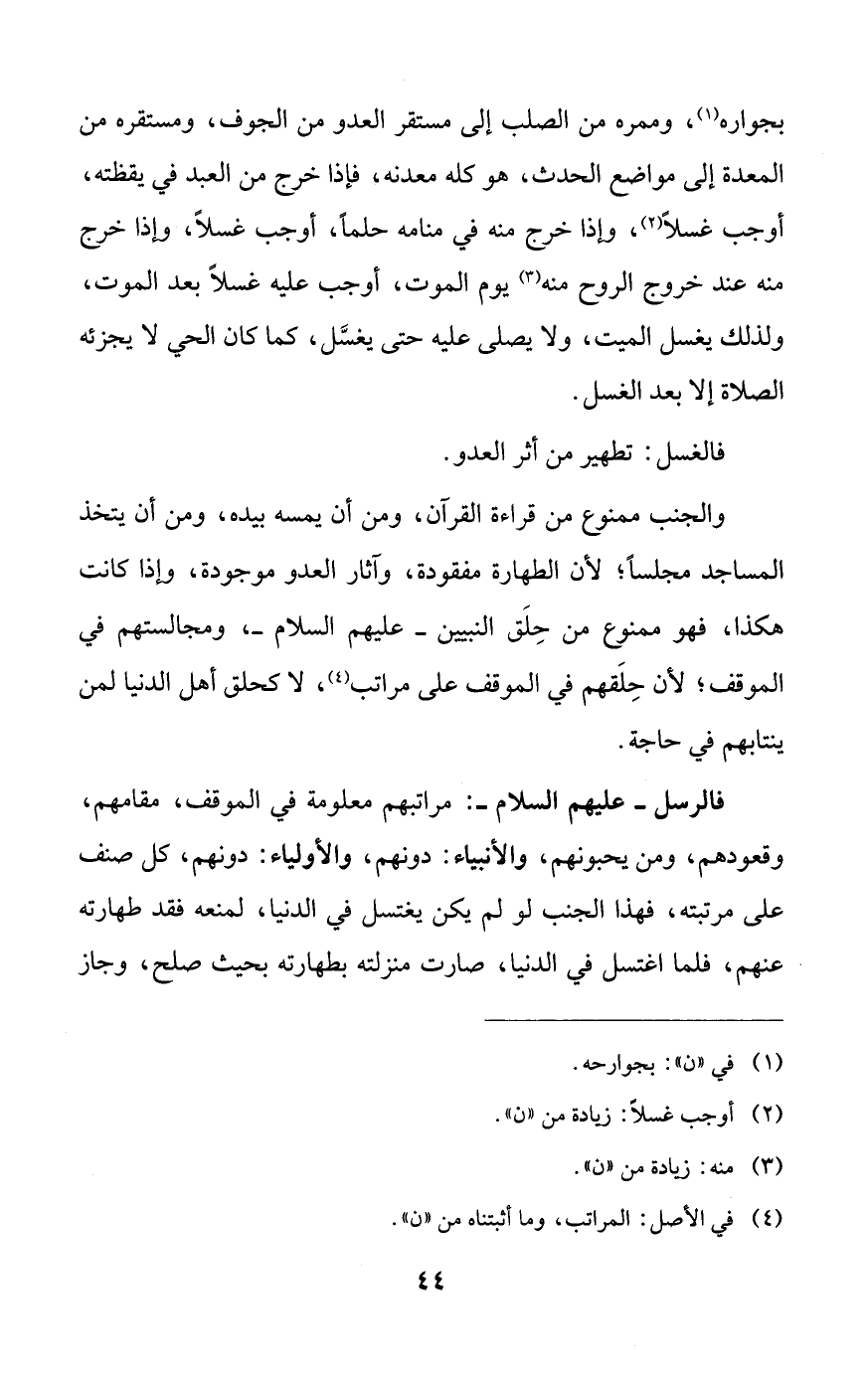 بجواره، وممره من الصلب إلى مستقر العدو من الجوف، ومستقره من المعدة إلى مواضع الحدث، هو كله معدنه، فإذا خرج من العبد في يقظته، أوجب غسلاً، وإذا خرج منه من منامه حلماً، أوجب غسلاً، وإذا خرج منه عند خروج الروح منه يوم الموت، أوجب عليه غسلاً بعد الموت، ولذلك يغسل الميت، ولا يصلى عليه حتى يغسل، كما كان الحي لا يجزئه الصلاة إلا بعد الغسل.