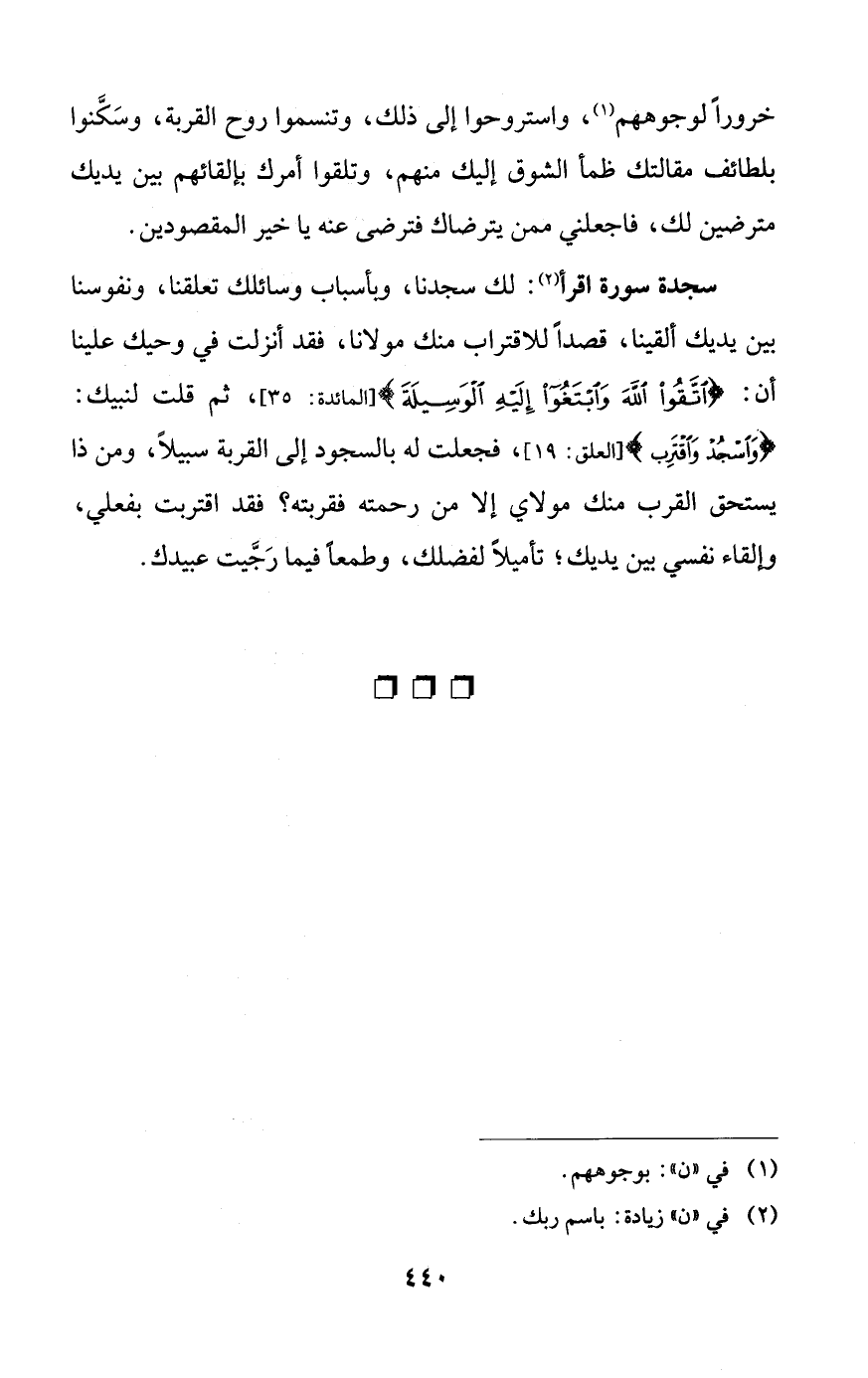 سجدة سورة اقرأ: لك سجدنا، وبأسباب وسائلك تعلقنا، ونفوسنا بين يديك ألقينا، قصداً للاقتراب منك مولانا، فقد أنزلت في وحيك علينا أن: {اتقوا الله وابتغوا إليه الوسيلة}، ثم قلت لنبيك: {واسجد واقترب}، فجعلت له بالسجود إلى القربة سبيلاً، ومن ذا يستحق القرب منك مولاي إلا من رحمته فقربته؟ فقد اقتربت بفعلي، وإلقاء نفسي بين يديك؛ تأميلاً لفضلك، وطمعاً فيما رجيت عبيدك.