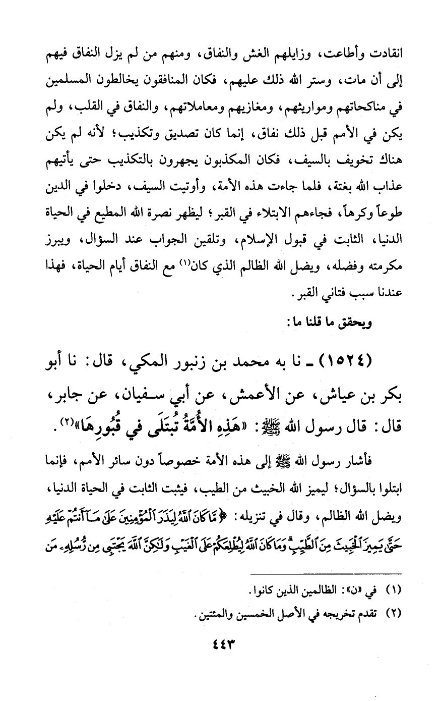 1524 - نا به محمد بن زنبور المكي، قال: نا أبو بكر بن عياش، عن الأعمش، عن أبي سفيان، عن جابر قال: قال رسول الله صلى الله عليه وسلم: ((هذه الأمة تبتلى في قبورها)).