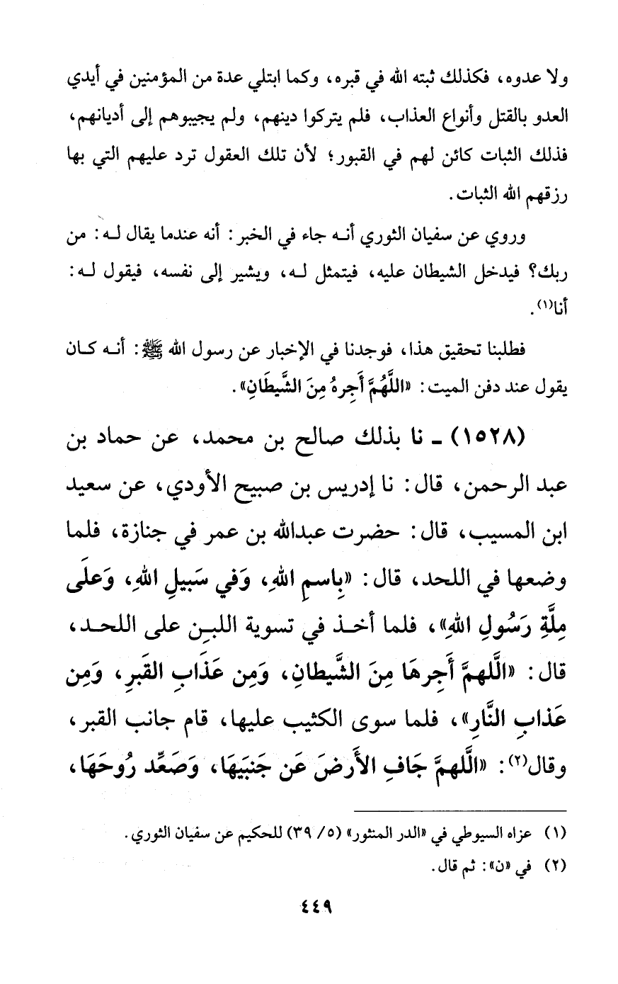 1528 - نا بذلك صالح بن محمد، عن حماد بن عبد الرحمن، قال: نا إدريس بن صبيح الأودي، عن سعيد ابن المسيب، قال: حضرت عبد الله بن عمر في جنازة، فلما وضعها في اللحد، قال: ((باسم الله، وفي سبيل الله، وعلى ملة رسول الله))، فلما أخذ في تسوية اللبن على اللحد، قال: ((اللهم أجرها من الشيطان، ومن عذاب القبر، ومن عذاب النار))، فلما سوى الكثيب عليها، قام جانب القبر، وقال: ((اللهم جاف الأرض عن جنبيها، وصعد روحها،