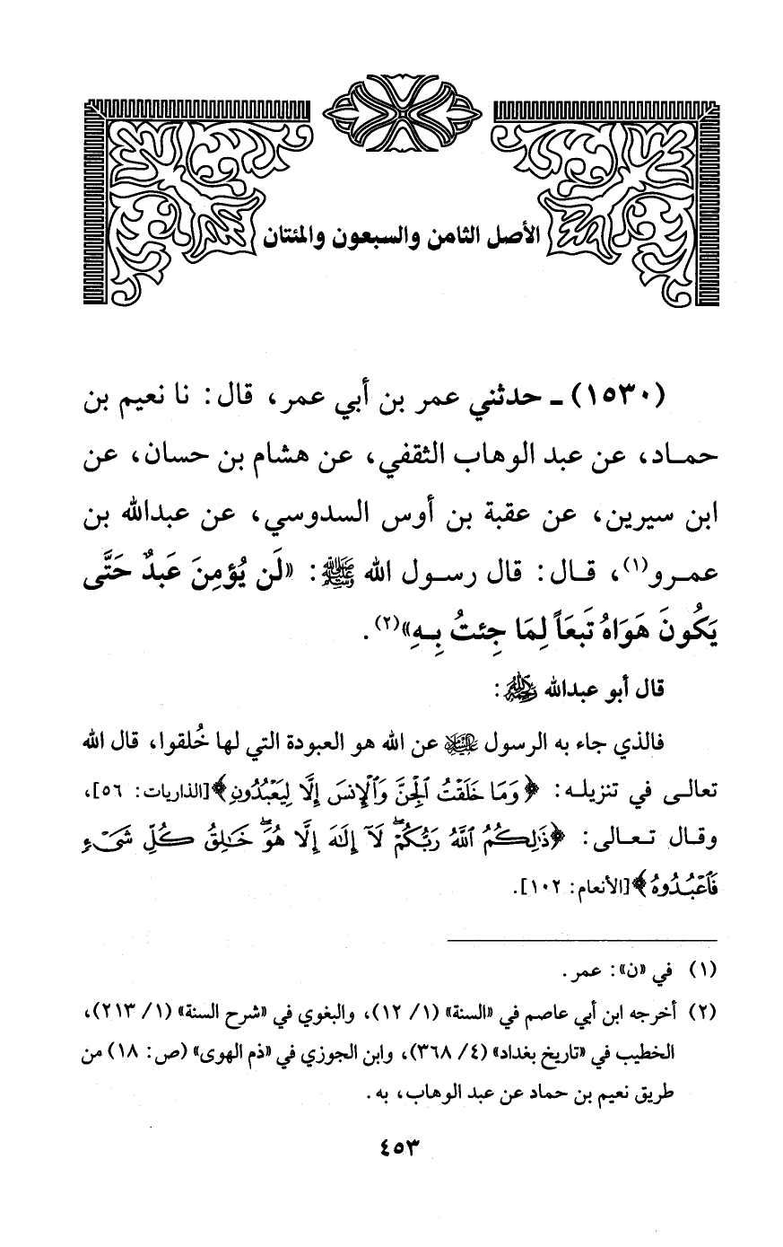 1530 - حدثني عمر بن أبي عمر، قال: نا نعيم بن حماد، عن عبد الوهاب الثقفي، عن هشام بن حسان، عن ابن سيرين، عن عقبة بن أوس السدوسي، عن عبد الله بن عمرو، قال: قال رسول الله صلى الله عليه وسلم: ((لن يؤمن عبدٌ حتى يكون هواه تبعاً لما جئت به)).