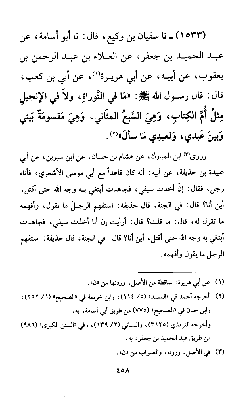 1533 - نا سفيان بن وكيع، قال: نا أبو أسامة، عن عبد الحميد بن جعفر، عن العلاء بن عبد الرحمن بن يعقوب، عن أبيه، عن أبي هريرة، عن أبي بن كعب، قال: قال رسول الله صلى الله عليه وسلم: ((ما في التوراة، ولا في الإنجيل مثل أم الكتاب، وهي السبع المثاني، وهي مقسومةٌ بيني وبين عبدي، ولعبدي ما سأل)).