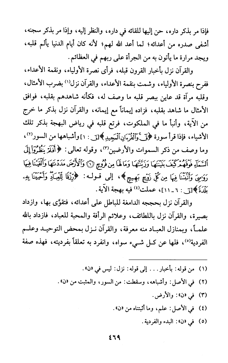 والقرآن نزل بحججه الدامغة للباطل على أعدائه، فتقوى بها، وازداد بصيرة، والقرآن نزل باللطائف، وعلائم الرأفة والمحبة للعباد، فازداد بالله علماً، وبمنازل العباد منه معرفة، والقرآن نزل بمحض التوحيد وعلم الفردية، فلها عن كل شيء سواه، وانفرد به تعلقاً بفرديته، فهذه صفة