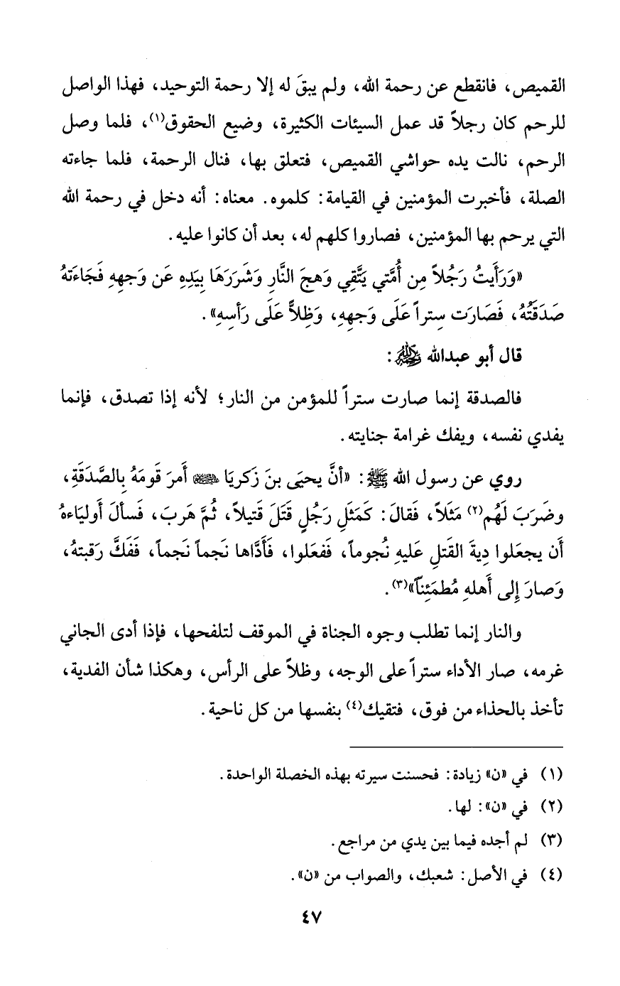 ((ورأيت رجلاً من أمتي يتقي وهج النار وشررها بيده عن وجهه فجاءته صدقته، فصارت ستراً على وجهه وظلاً على رأسه)).